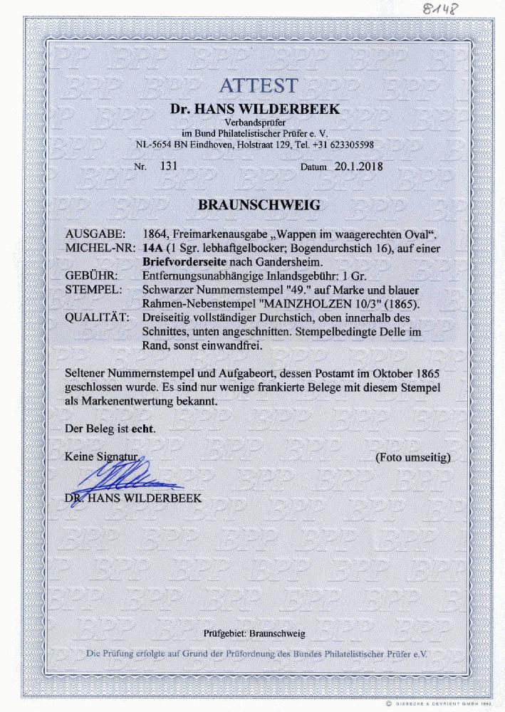 | Prüfer: | Wilderbeek, Hans (BPP (Bund Philatelistischer Prüfer)) |