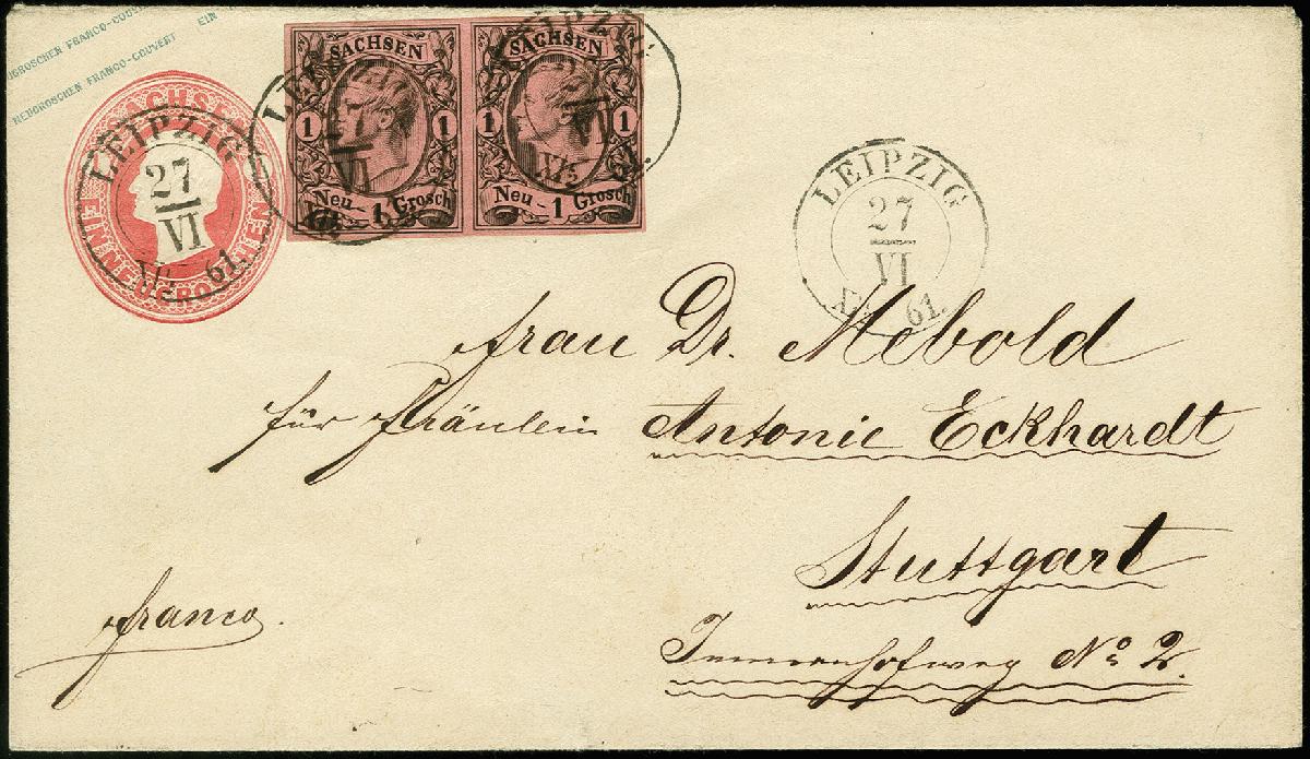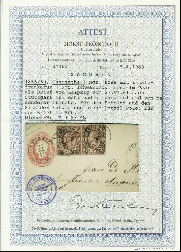 | Zusatzinformationen und Suchstichworte: | 366. Auktion Heinrich Köhler Auktionstermin 19.–24.03.2018 Los 9001 1 Ngr. Johann mit Zufrankatur 1 Ngr. auf hellrötlichkarmin im Paar, entwertet mit DKr. "LEIPZIG 27 VI 61" in den Postverein nach Stuttgart, sign. und Fotoattest Pröschold BPP, ausgezeichnet erhalten Zuschlag 300,00 EUR |