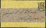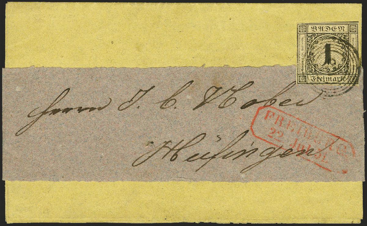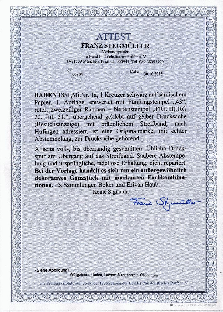 | Zusatzinformationen und Suchstichworte: | 370. Auktion Heinrich Köhler 8. Juni 2019 Los 2 1 Kreuzer schwarz auf sämisch, farbfrisch und allseits voll- bis überrandig, unten und oben mit Teilen der Nachbarmarken, mit übergehend aufgesetztem Nummernstempel "43" und sauber nebengesetztem Rahmenstempel "FREIBURG 22 Jul. 51" auf vollständiger Streifbandsendung nach Hüfingen mit Eingangsstempel vom nächsten Tag. Ein außergewöhnlich schönes Stück in tadelloser Erhaltung (unvermeidliche Druckspur beim Übergang von Streife und Drucksache). Fotoattest Stegmüller BPP (2018) Ausruf 1.500,00 EUR Zuschlag 6500,00 EUR (aus der Sammlung Erivan Haub) |