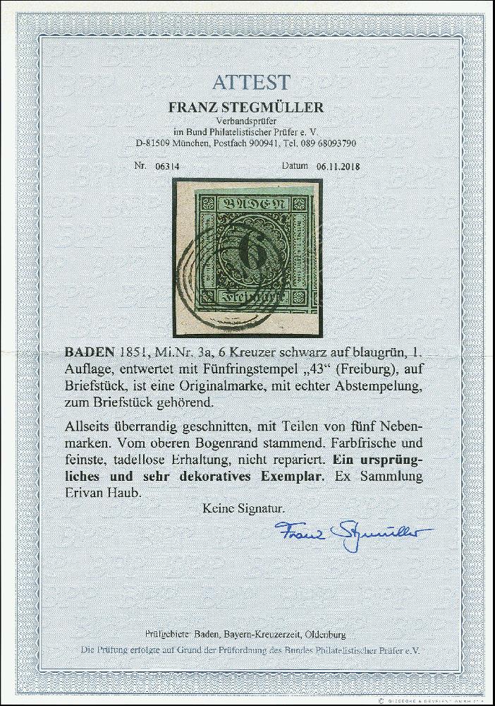 | Zusatzinformationen und Suchstichworte: | 370. Auktion Heinrich Köhler 8. Juni 2019 Los 3 6 Kreuzer schwarz auf blaugrün in schöner frischer tiefer Farbe, allseits überrandig, oben mit schmalem Bogenrand, unten und seitlich mit Teilen aller 5 Nachbarmarken, leicht und sauber entwertet durch Nummernstempel "43" FREIBURG; ein absolutes Ausnahmestück der 1. Auflage, Fotoattest Stegmüller BPP (2018) Ausruf 100,00 EUR Zuschlag 900,00 EUR (aus der Sammlung Erivan Haub) |