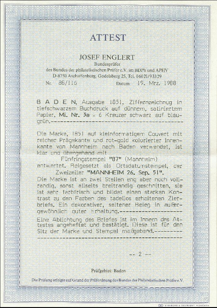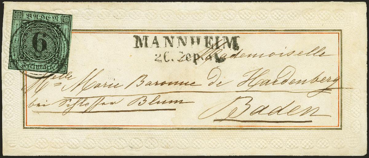 | Zusatzinformationen und Suchstichworte: | 370. Auktion Heinrich Köhler 8. Juni 2019 Los 5 6 Kreuzer schwarz auf blaugrün in frischer tiefer Farbe, oben kurzer Randlinienschnitt, sonst voll bis breitrandig, mit sauber aufgesetztem Nummernstempel "87" und klar nebengesetztem Langstempel "MANNHEIM 26 Sep. 51" auf kleinem Damen-Kuvert mit farblos geprägter Zierborde und in rot und gold gedrucktem Adressrahmen, adressiert an die Baronesse von Hardenberg in Baden-Baden; ein außerordentlich schöner und dekorativer Brief in tadelloser und völlig ursprünglicher Erhaltung. Fotoatteste Englert BPP (1988) und Stegmüller BPP (2018) Ausruf 1.000,00 EUR Zuschlag 4.400,00 EUR (aus der Sammlung Erivan Haub) |