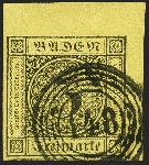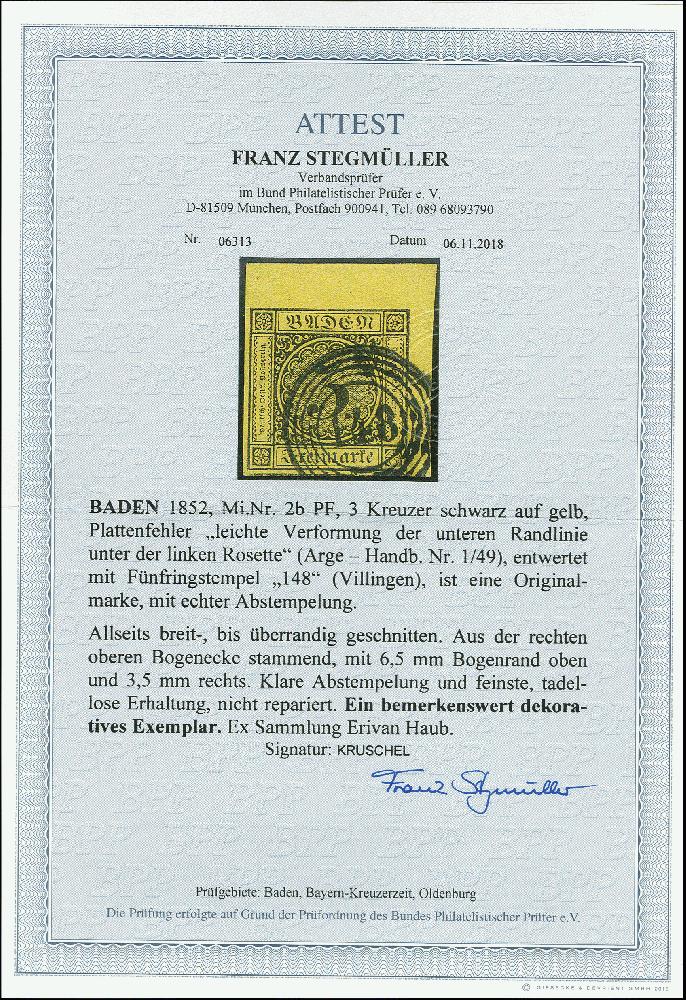 | Zusatzinformationen und Suchstichworte: | 370. Auktion Heinrich Köhler 8. Juni 2019 Los 6 2. Auflage: 3 Kreuzer schwarz auf gelb mit kleinem Plattenfehler in der linken unteren Randlinie; schöne leuchtende frische Farbe, allseits breit- bis überrandig mit Teil der unteren Nachbarmarke sowie 3,5/6,5 mm Bogenrändern rechts und oben, wunderschön entwertet durch Nummernstempel "148" VILLINGEN; ein außerordentlich schönes Stück in tadelloser Erhaltung Ausruf 150,00 EUR Zuschlag 650,00 EUR (aus der Sammlung Erivan Haub) |