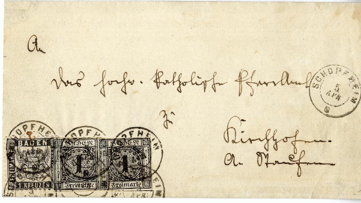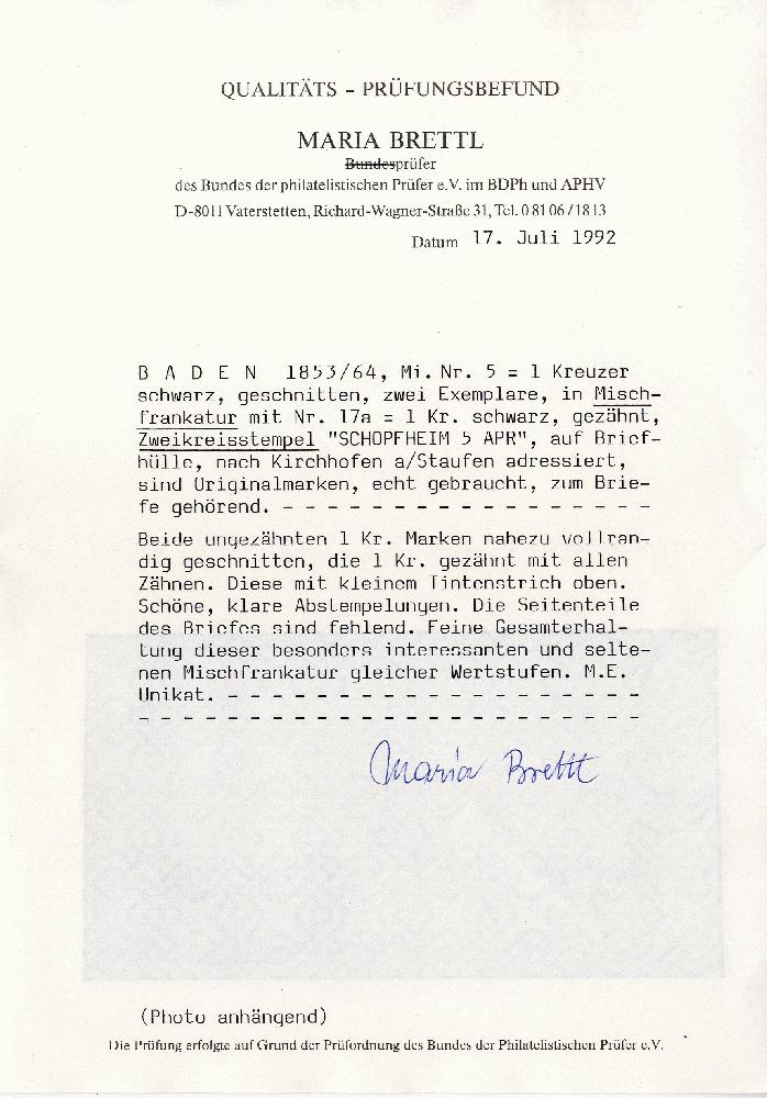 | Zusatzinformationen und Suchstichworte: | 370. Auktion Heinrich Köhler 8. Juni 2019 Los 10 1853/54, 1 Kreuzer schwarz, zwei Einzelwerte, beide einseitig kurz berührt, sonst voll- bis breitrandig, in wertstufengleicher Mischfrankatur mit 1864, Wappen auf weißem Grund 1 Kreuzer schwarz, als Streifen geklebt mit höchst ungewöhnlicher Entwertung durch sechsfach aufgesetzten Doppelkreisstempel "SCHOPFHEIM 5 APR." auf Briefhülle (Seitenklappen fehlend) nach Kirchhofen bei Staufen mit rückseitigem Durchgangsstempel von Krotzingen. Eine hochatrraktive und einmalige Mischfrankatur gleicher Wertstufe, dabei zwei Ausgaben überspringend.Qualitäts-Prüfungsbefund Brettl BPP (1992) Ausruf 3.000,00 EUR Zuschlag 8.500,00 EUR (aus der Sammlung Erivan Haub) |