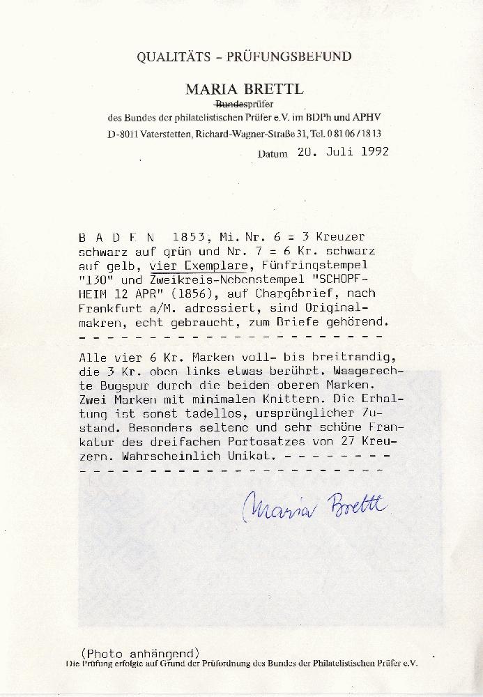 | Zusatzinformationen und Suchstichworte: | 370. Auktion Heinrich Köhler 8. Juni 2019 Los 11 3 Kreuzer schwarz auf grün und 4 Einzelwerte 6 Kreuzer schwarz auf gelb, alle farbfrisch, die 3 Kreuzer leicht berührt, sonst alle voll- bis breitrandig, mit Nummernstempel "130" auf rekommandiertem Brief der 3. Gewichtstufe von "SCHOPFHEIM 12 APR." (1856) nach Frankfurt/Main. Durch die beiden oben klebenden Werte verläuft eine waagerechte Bugspur, sonst bis auf leichte Knitter einwandfrei. Eine ganz außergewöhnliche 27 Kreuzer-Frankatur und eine der spektakulärsten Postvereins-Frankaturen der geschnittenen Ausgaben. Qualitäts-Prüfungsbefund Brettl BPP (1992) Ausruf 4.000,00 EUR Zuschlag 6.500,00 EUR (aus der Sammlung Erivan Haub) |