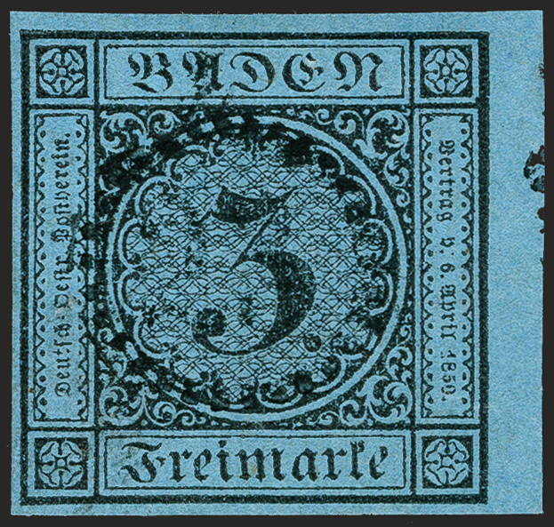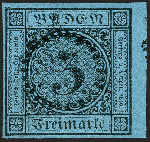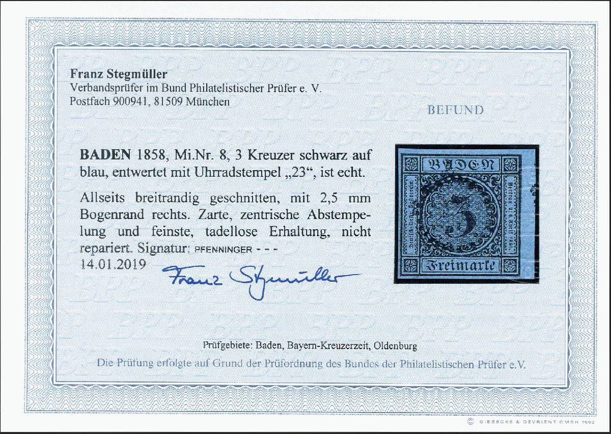 | Zusatzinformationen und Suchstichworte: | 370. Auktion Heinrich Köhler 8. Juni 2019 Los 14 3 Kreuzer schwarz auf blau, allseits voll- bis breitrandig, rechts mit 2,5 mm Bogenrand, sehr schön entwertet durch leicht, gerade und zentrisch aufgesetztem Uhrradstempel "23". Ein ungewöhnliches Stück in sehr schöner und tadelloser Erhaltung. Signiert Pfenninger und Fotobefund Stegmüller BPP Ausruf 80,00 EUR Zuschlag 150,00 EUR (aus der Sammlung Erivan Haub) |