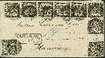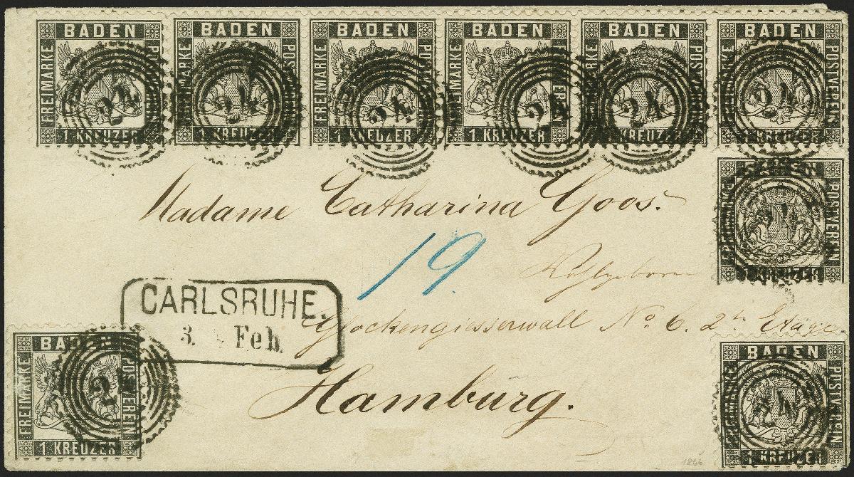 | Zusatzinformationen und Suchstichworte: | 370. Auktion Heinrich Köhler 8. Juni 2019 Los 18 1862/66, Wappen auf weißem Grund 1 Kreuzer schwarz, waagerechter 5er-Streifen und 4 Einzelstücke, alle farbfrisch und einwandfrei gezähnt, mit jeweils sauber aufgesetztem Zackenkranzstempel "24" und sauber nebengesetztem Rahmenstempel "CARLSRUHE 3 Feb." (1866) auf Briefkuvert nach Hamburg; die links unten klebende Marke leichte Randschürfungen und die rechts unten klebende in der Zähnung gering bestoßen, sonst völlig einwandfreie und sehr schöne Erhaltung. Eine außerordentlich seltene und besonders attraktive 9 Kreuzer-Massenfrankatur. Signiert Kosack, Fotoatteste Englert BPP (1986) und Stegmüller (BPP) (2018) Ausruf 3.000,00 EUR Zuschlag 5.500,00 EUR (aus der Sammlung Erivan Haub) |