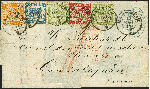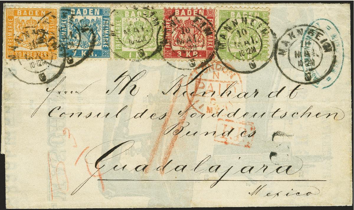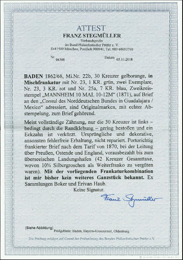 | Zusatzinformationen und Suchstichworte: | 370. Auktion Heinrich Köhler 8. Juni 2019 Los 21 1862, 30 Kreuzer dunkelgelblichorange in Mischfrankatur mit der kompletten Ausgabe von 1868, 1 Kreuzer grün (2 Einzelwerte), 3 Kreuzer karmin und 7 Kreuzer blau mit Doppelkreisstempel "MANNHEIM 10 MAI." (1871) auf Briefhülle mit innenseitiger Werbung der Nähmaschinen-Firma 'Bassermann & Mondt' via Preußen, Belgien und England an den Konsul des Norddeutschen Bundes in Guadalajara in Mexiko, portogerecht frankiert mit 42 Kreuzern und bezahlt bis zum Anlandehafen; das inländische mexikanische Porto in Höhe von "3" Reales wurde vom Empfänger eingezogen. Die gesamte Frankatur präsentiert sich in sehr schöner farbfrischer Erhaltung; die 30 Kreuzer durch Randklebung in der Zähnung gering bestoßen mit verkürztem Eckzahn oben, sonst einwandfreie und frische ursprüngliche Erhaltung. Briefe der altdeutschen Staaten nach Mexiko sind ausnahmslos selten; der hier vorliegende Brief mit seiner einmaligen Frankaturkombination stellt eine besondere Rarität dar. Fotoattest Stegmüller BPP (2018) Ausruf 6.000,00 EUR Zuschlag 17.000,00 EUR (aus der Sammlung Erivan Haub) |
