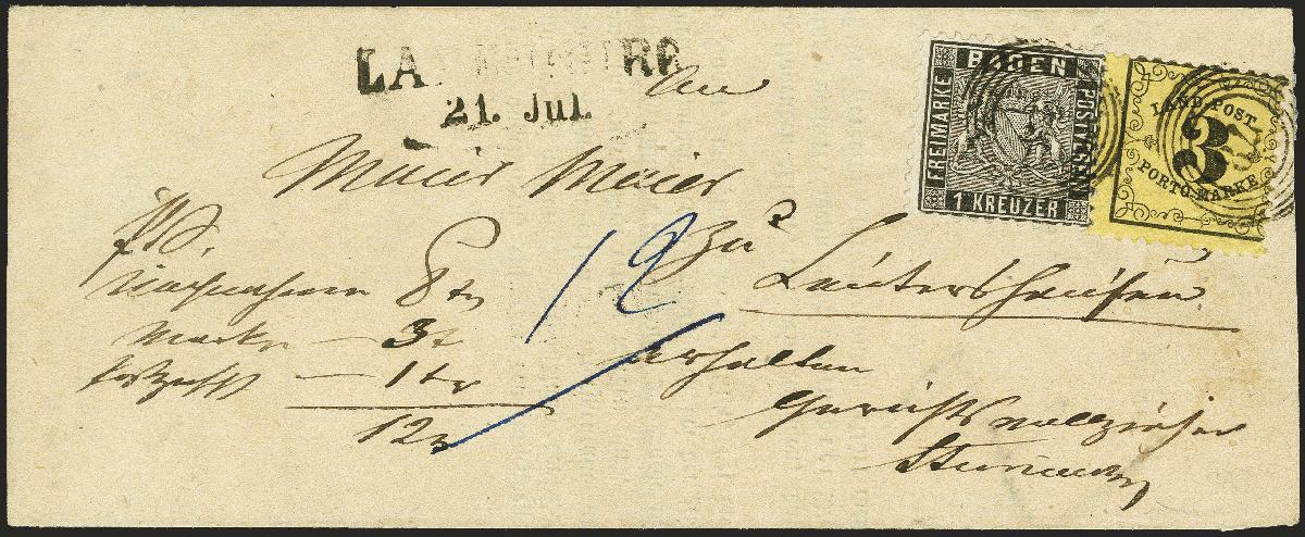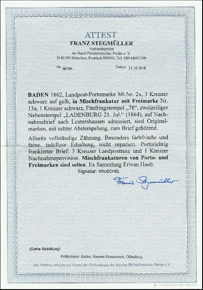 | Zusatzinformationen und Suchstichworte: | 370. Auktion Heinrich Köhler 8. Juni 2019 Los 23 1862, 3 Kreuzer schwarz auf gelb in Mischfrankatur mit Freimarke 1862, 1 Kreuzer schwarz, beide farbfrisch und einwandfrei gezähnt mit sauberem Nummernstempel "78" und nebengesetztem zweizeiligem Langstempel "LADENBURG 21. Jul" auf Nachnahmebrief nach Leutershausen. Der Brief ist portogerecht frankiert mit 3 Kreuzern Landposttaxe und 1 Kreuzer Nachnahmeprovision. Derartige Mischfrankaturen von Landpost- und Freimarken sind auf Brief außerordentlich selten und kommen fast ausschließlich mit 3 Kreuzer-Werten der Ausgabe 1862 vor. Mit der hier vorliegenden Kombination hat die Köhler-Kartei drei weitere Belege registriert, davon sind jedoch zwei Stücke seit den 1920er Jahren nicht mehr aufgetaucht. Signiert Kruschel sowie Fotoattest Stegmüller BPP (2018) Ausruf 3.000,00 EUR Zuschlag 5.000,00 EUR (aus der Sammlung Erivan Haub) |