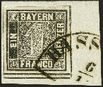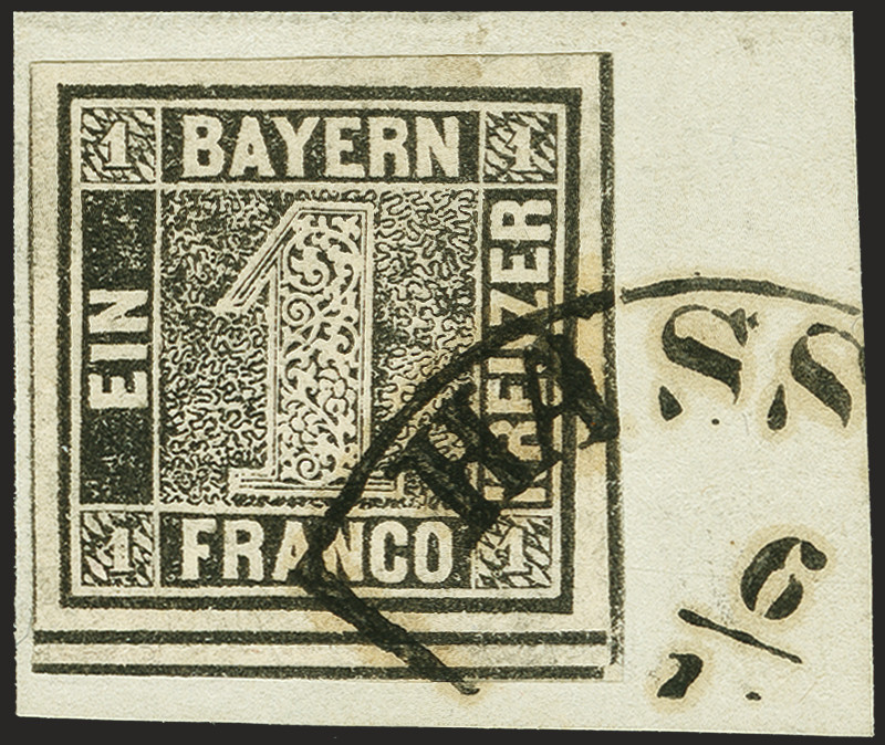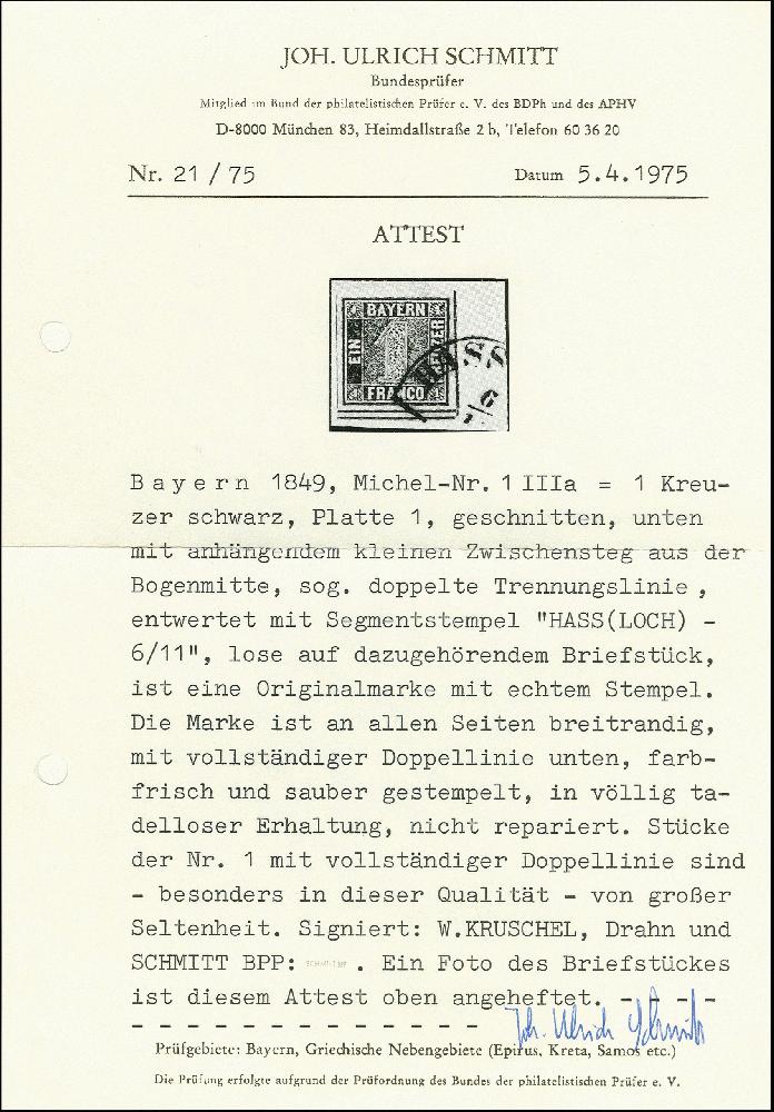 | Zusatzinformationen und Suchstichworte: | 370. Auktion Heinrich Köhler 8. Juni 2019 Los 26 1849, 1 Kreuzer schwarz, Platte 1, allseits sehr breitrandig, vom rechten Bogenrand stammend, mit Zwischenlinien links und rechts sowie vollständiger doppelter Zwischenlinie unten (sogenannte 'Kleine Brücke'), mit sauber aufgesetztem Halbkreisstempel von Hassloch auf kleinem Briefstück. Die Marke ist zur Prüfung gelöst und mit Falz replatziert worden, sie befindet sich in tadelloser Erhaltung. Ein außerordentlich schönes Briefstück mit der seltenen Variante. Signiert Kruschel, Drahn und Schmitt BPP, Fotoattest Schmitt BPP (1975) Ausruf 2.000,00 EUR Zuschlag 3.800,00 EUR (aus der Sammlung Erivan Haub) |