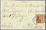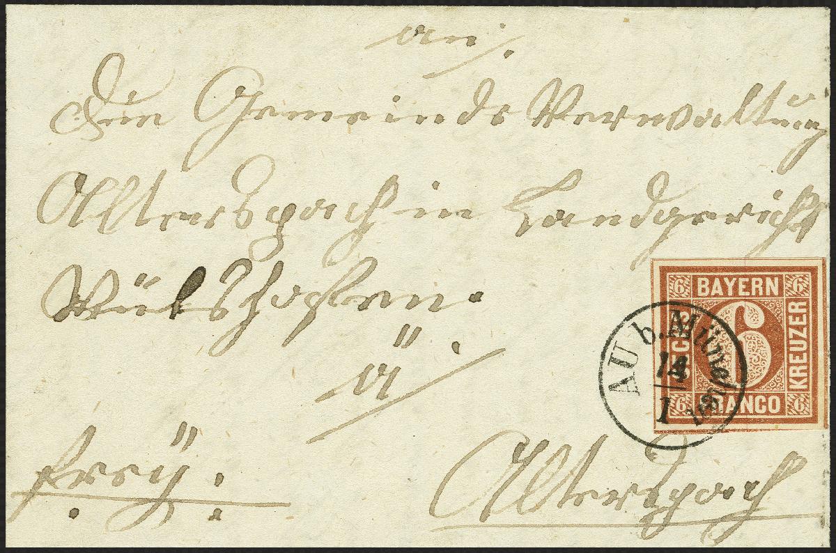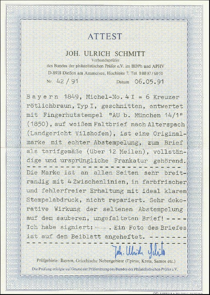 | Zusatzinformationen und Suchstichworte: | 370. Auktion Heinrich Köhler 8. Juni 2019 Los 29 1849, 6 Kreuzer braunorange, sehr schön farbfrisch und allseits breitrandig mit Zwischenlinien an allen Seiten, mit glasklar aufgesetztem Fingerhutstempel "AU b. München 14/1" (1850) auf kleinem Faltbrief nach Alterspach. Ein phantastisch schöner Brief in exquisiter Erhaltung, Luxus. Signiert Schmitt BPP mit Fotoattest (1991) Ausruf 1.000,00 EUR Zuschlag 10.000,00 EUR (aus der Sammlung Erivan Haub) |