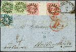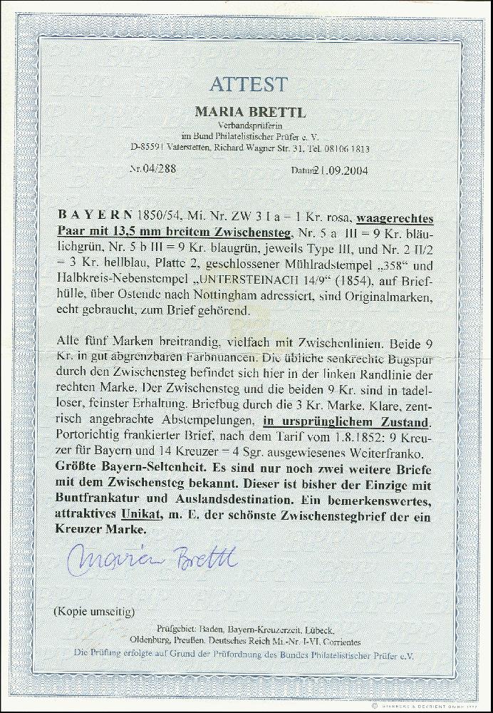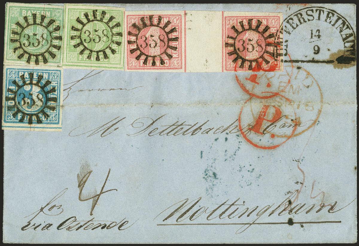 | Zusatzinformationen und Suchstichworte: | 370. Auktion Heinrich Köhler 8. Juni 2019 Los 32 1850/58, 1 Kreuzer rosa im waagerechten Zwischenstegpaar zusammen mit 3 Kreuzer blau, Platte 2, sowie zwei Einzelwerten 9 Kreuzer in bläulichgrün bzw. blaugrün, mit jeweils zentrisch klar aufgesetztem geschlossenen Mühlradstempel "358" und teils auf das Zwischenstegpaar übergehendem Halbkreisstempel "UNTERSTEINAU 14/9" auf Briefhülle über Preußen und Belgien nach Nottingham in England, portogerecht frankiert nach dem Tarif vom 1.8.1852 mit 9 Kreuzern bayerischem Porto und 14 Kreuzern (= 4 Silbergroschen) ausgewiesenem Weiterfranko. Alle Marken der Frankatur sind sehr schön farbfrisch und voll- bis meist breitrandig; die übliche Faltung im Zwischensteg befindet sich in diesem Fall in der linken Randlinie der rechten Marke; durch die 3 Kreuzer verläuft ein waagerechter Briefbug, sonst einwandfreie und sehr schöne ursprüngliche Erhaltung. Gebrauchte Zwischenstege gehören zu den großen Seltenheiten der Bayern-Philatelie; von der gesamten Quadratausgabe haben wir nur 10 Briefe mit waagerechten Zwischenstegpaaren registriert, davon nur ein weiterer ins Ausland; dies ist der einzige Brief mit einem Zwischenstegpaar als Teil einer Buntfrankatur. Ein ebenso attraktiver wie seltener Brief der bis im Jahre 2004 unerkannt in einer alten Korrespondenz schlummerte. Eins der Spitzenstücke der Quadratausgaben. Fotoattest Brettl BPP (2004) Ausruf 30.000,00 EUR Zuschlag 100.000,00 EUR (aus der Sammlung Erivan Haub) |