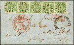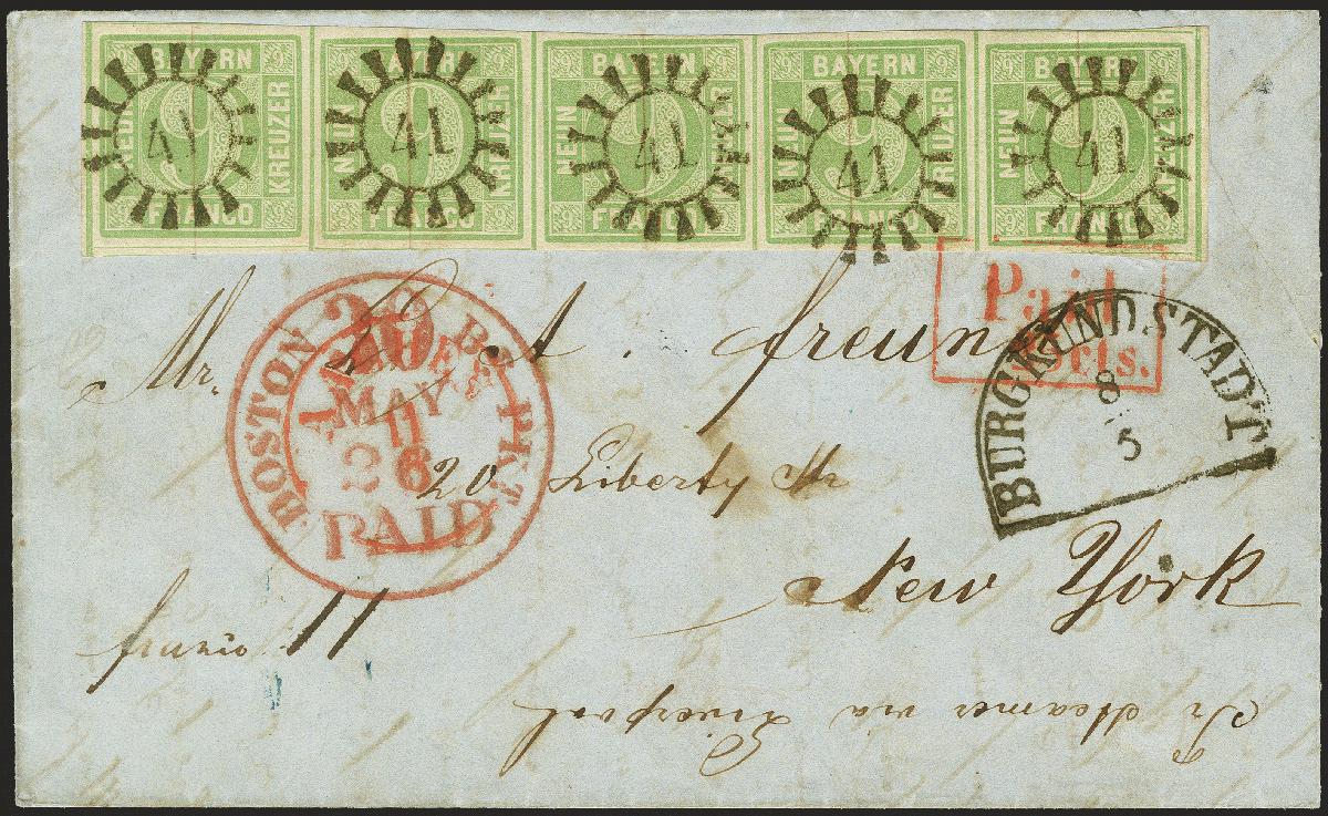 | Zusatzinformationen und Suchstichworte: | 370. Auktion Heinrich Köhler 8. Juni 2019 Los 33 9 Kreuzer bläulichgrün im waagerechten 5er-Streifen, dabei die rechte Marke in Type II, sonst Type III, sehr schön farbfrisch und allseits breit- bis überrandig, jeder Wert mit klarem geschlossenem Mühlradstempel "41" und nebengesetztem Halbkreisstempel "BURGKUNDSTADT 8/5" auf Briefhülle mit großem Teil des Inhaltes über Aachen und England nach New York mit vorderseitigem Eingangsstempel "BOSTON BR. PKT. 30 PAID / MAY 26". Ein außerordentlich schöner Brief mit einer seltenen Streifeneinheit der guten Farbe in tadelloser Erhaltung. Signiert Kruschel und Fotoattest Schmitt BPP (1977) Ausruf 5.000,00 EUR Zuschlag 14.500,00 EUR (aus der Sammlung Erivan Haub) |