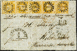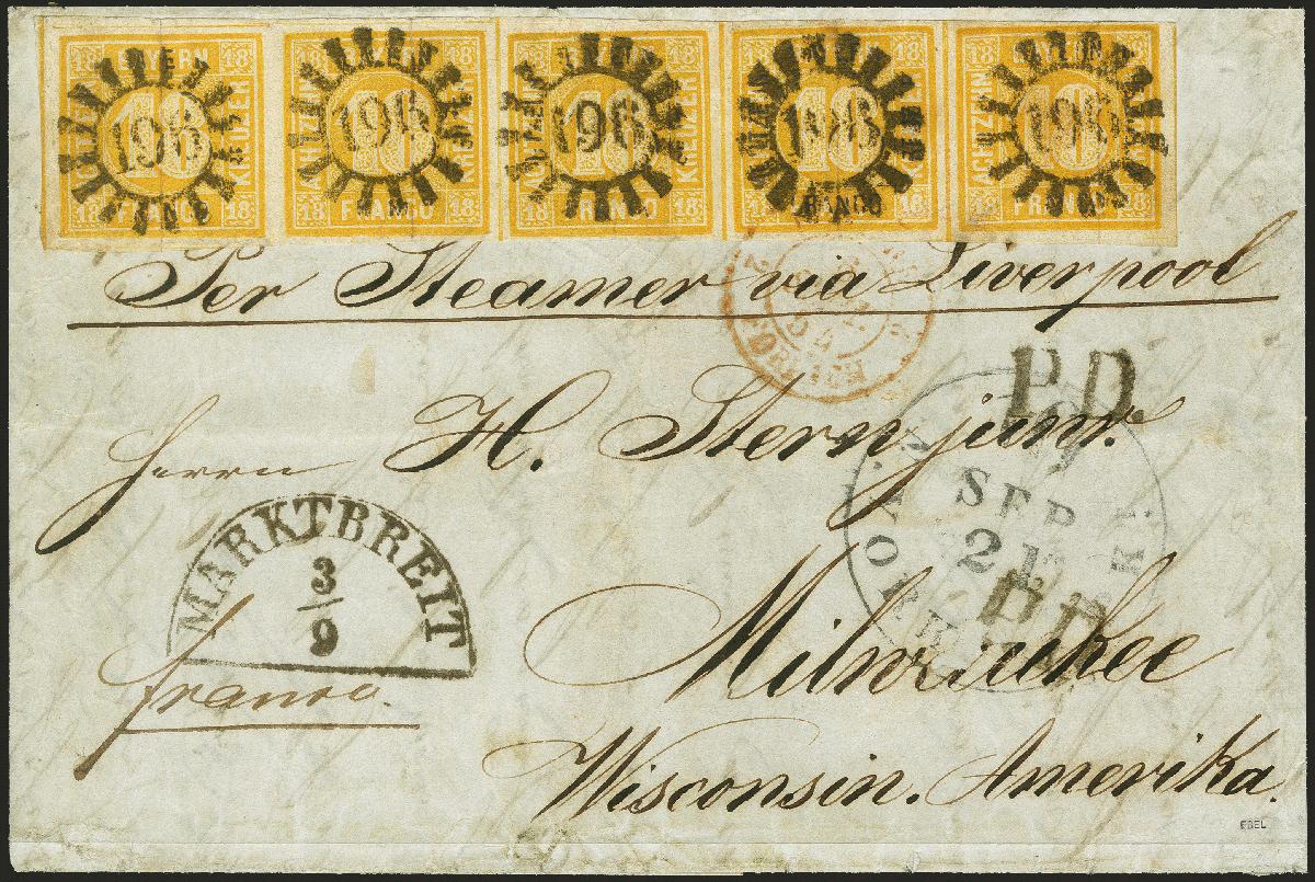 | Zusatzinformationen und Suchstichworte: | 370. Auktion Heinrich Köhler 8. Juni 2019 Los 34 1850/58, 18 Kreuzer gelblichorange im waagerechten 5er-Streifen, sehr schön farbfrisch und allseits voll- bis breitrandig, teils mit Schnittlinien, mit jeweils zentrisch aufgesetztem geschlossenen Mühlradstempel "196" und nebengesetztem Halbkreisstempel "MARKTBREIT 3/9" (1854) auf Briefhülle (kleine Fehlstelle hinterlegt) der 2. Gewichtsstufe über Frankreich und England nach Milwaukee. Vorderseitiger Eingangsstempel von New York und auf die Frankatur übergehender Transitstempel. Bei den drei linken Marken des Streifens wurden aus optischen Gründen bayernbrüchige Stellen im Unterrand behoben, die 4. Marke oben unauffälliger kleiner Randspalt, sonst einwandfreie und sehr schöne Erhaltung. Eine ebenso attraktive wie seltene Streifenfrankatur des Höchstwertes. Signiert Ebel und Fotoattest Sem BPP (2018) Ausruf 4.000,00 EUR Zuschlag 17.000,00 EUR (aus der Sammlung Erivan Haub) |