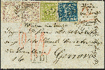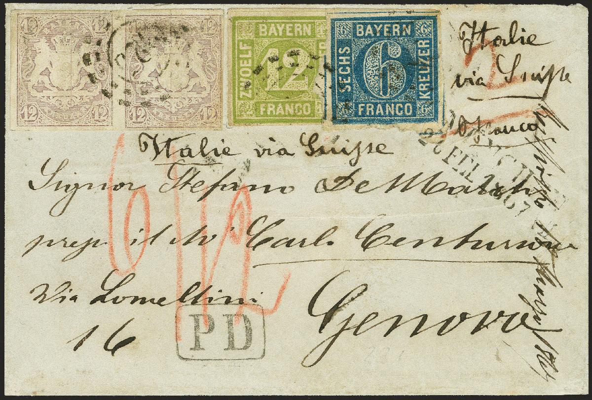 | Zusatzinformationen und Suchstichworte: | 370. Auktion Heinrich Köhler 8. Juni 2019 Los 38 1862, 6 Kreuzer blau zusammen mit wertstufengleicher Mischfrankatur von 12 Kreuzer grün und 1867, Wappen 12 Kreuzer lila im waagerechten Paar, alle voll- bis teils breitrandig, die 12 Kreuzer-Werte mit unauffälligen waagerechten Knittern im oberen Bereich, die 6 Kreuzer mit behobenen bayernbrüchigen Stellen am Unterrand, mit offenem Mühlradstempel "325" und teils übergehendem zweizeiligem Langstempel "MÜNCHEN 26 FEB. 1867" auf kleinem Briefkuvert der 2. Gewichtsstufe über die Schweiz nach Genua. Das Porto setzte sich zusammen aus 18 Kreuzern bayerisches Porto, 12 Kreuzern schweizer Transit und 12 Kreuzern italienischem Anteil; das Weiterfranko für den Schweizer Transit irrtümlich nur "6" Kreuzer für das einfache Porto notiert. Trotz der kleinen Unzulänglichkeiten ein attraktiver Brief mit einer sehr seltenen Frankaturkombination; wir haben keine weitere in dieser Zusammenstellung registriert. Fotoattest Sem BPP (2018) Ausruf 1.000,00 EUR Zuschlag 4.200,00 EUR (aus der Sammlung Erivan Haub) |