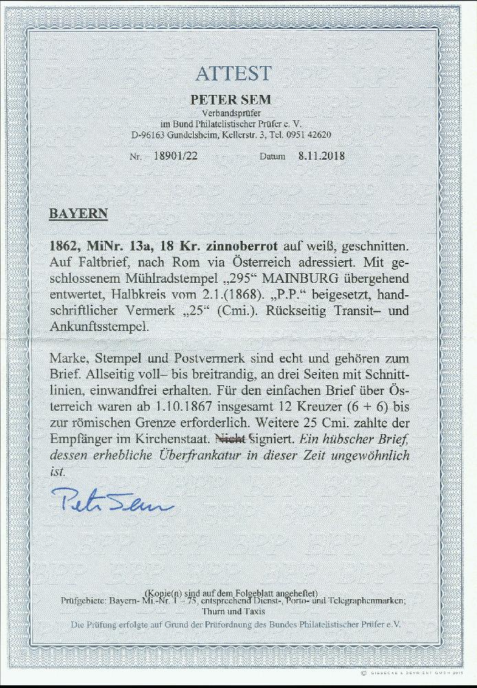 | Zusatzinformationen und Suchstichworte: | 370. Auktion Heinrich Köhler 8. Juni 2019 Los 39 1862, 18 Kreuzer zinnoberrot, farbfrisch und voll- bis breitrandig mit Schnittlinien an drei Seiten, mit sauber aufgesetztem geschlossenem Mühlradstempel "295" und nebengesetztem Halbkreisstempel "MAINBURG 2/1" (1868) auf Briefhülle mit Leitvermerk "via Oesterreich" nach Rom im Kirchenstaat. Der Brief zeigt eine ungewöhnlich hohe Überfrankatur; seit 1.10.1867 betrug das Porto pro Loth 6 Kreuzer bayerisches Porto und 6 Kreuzer italienisches Porto bis zur Grenze des Kirchenstaates, das dortige Inlandsporto konnte nicht vorfrankiert werden und wurde vom Empfänger eingezogen. Eine attraktive und interessante Einzelfrankatur in einwandfreier Erhaltung. Signiert Georg Bühler mit Fotoattest (1978) und Fotoattest Sem BPP (2018) Ausruf 500,00 EUR Zuschlag 2.200,00 EUR (aus der Sammlung Erivan Haub) |