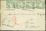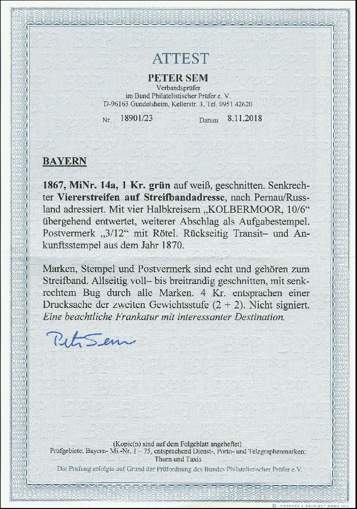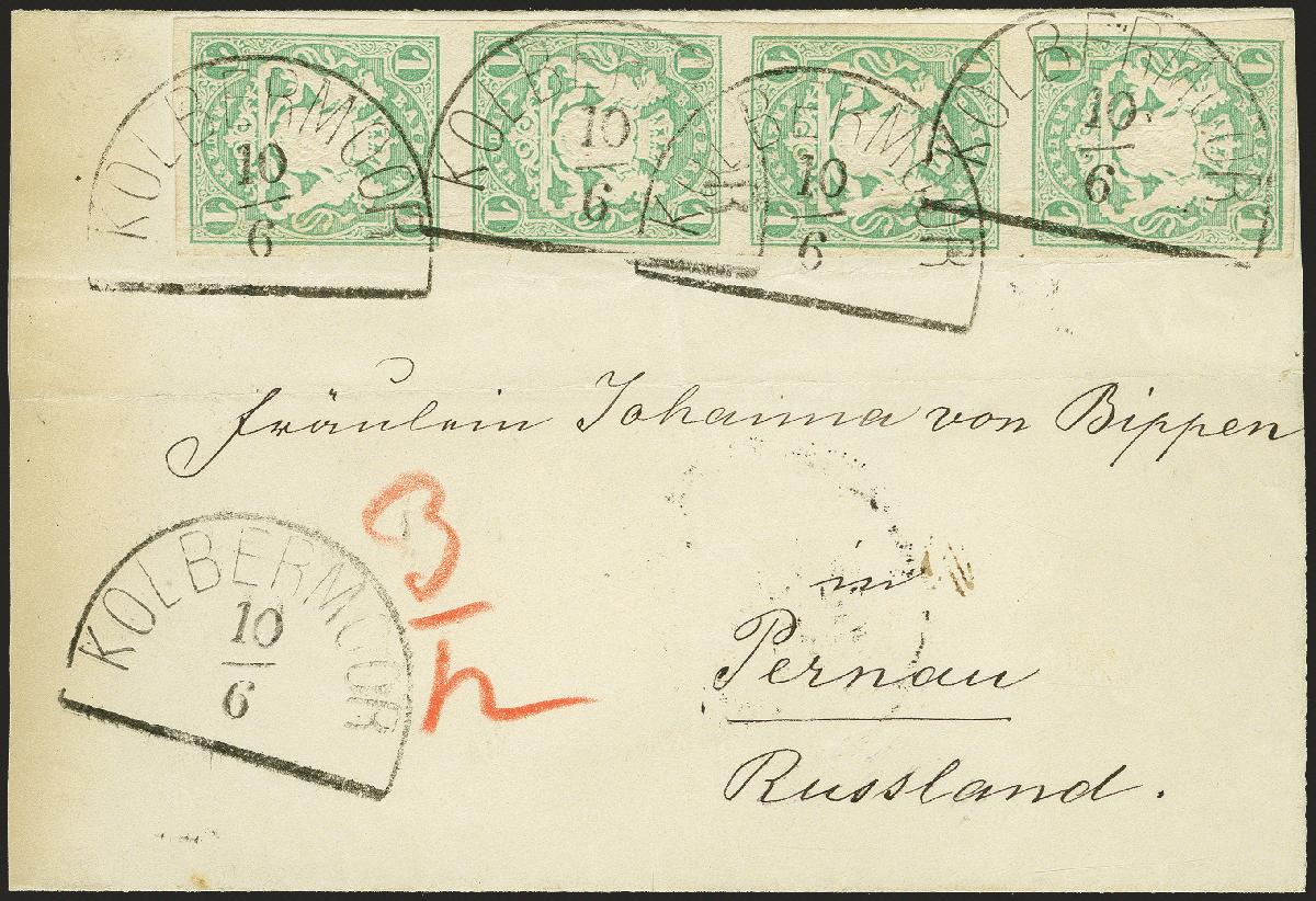 | Zusatzinformationen und Suchstichworte: | 370. Auktion Heinrich Köhler 8. Juni 2019 Los 40 1867, Wappenausgabe1 Kreuzer grün im senkrechten 4er-Streifen, farbfrisch und allseits voll- bis breitrandig mit jeweils klar aufgesetztem Halbkreisstempel "KOLBERMOOR 10/6" (1870) auf Streifband der zweiten Gewichtsstufe nach Pernau in Russland mit rückseitigen Transit- und Ankunftsstempeln. Der Streifen wurde bereits mit einem senkrecht durch alle Marken verlaufenden unauffälligen Bug aufgeklebt, sonst schöne und frische Erhaltung. Eine attraktive und seltene Auslandsdrucksache. Fotoattest Sem BPP (2018) Ausruf 500,00 EUR Zuschlag 3.400,00 EUR (aus der Sammlung Erivan Haub) |