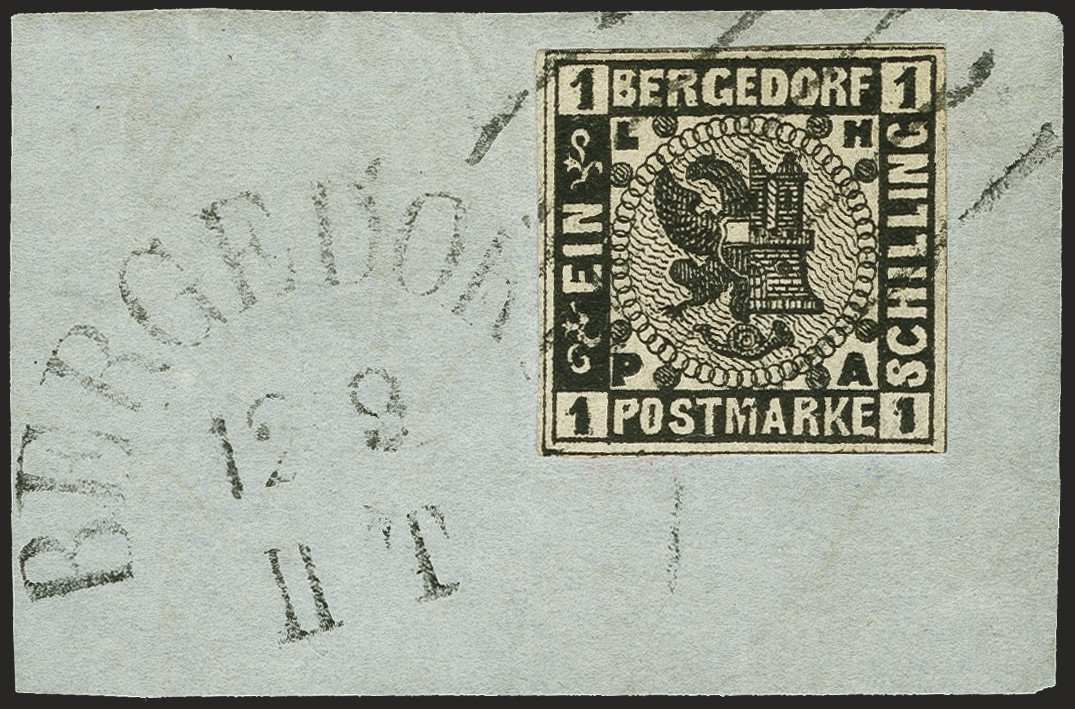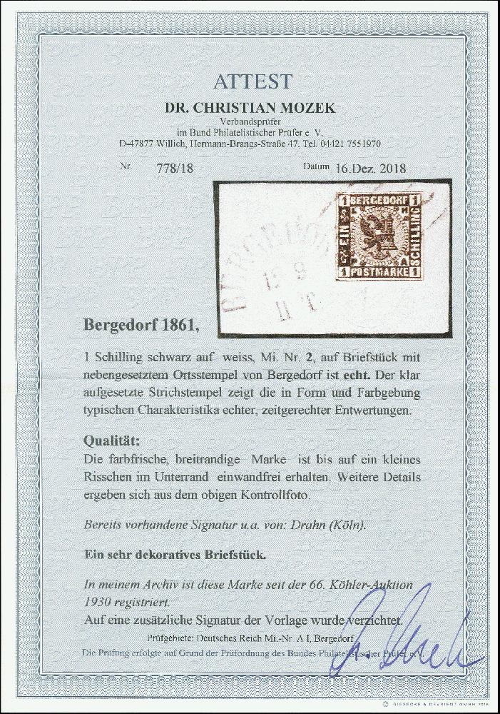 | Zusatzinformationen und Suchstichworte: | 370. Auktion Heinrich Köhler 8. Juni 2019 Los 46 1861, 1 Schilling schwarz, farbfrisch und allseits breitrandig mit allen Zwischenlinien, mit leicht und sauber aufgesetztem Strichstempel sowie leicht übergehendem Ortsstempel "BERGEDORF 12 9/II T" auf Briefstück. Die Marke war zur Kontrolle gelöst; sie hat am Unterrand winziges unmerkliches Randrisschen, sonst tadellos. Ein sehr schönes und dekoratives Briefstück. Signiert Drahn und Kruschel sowie Fotoattest Dr. Mozek BPP (2018) Ausruf 500,00 EUR Zuschlag 550,00 EUR (aus der Sammlung Erivan Haub) |