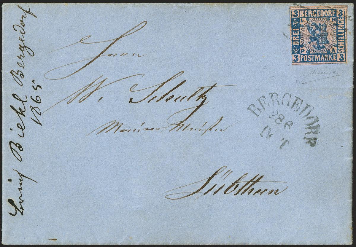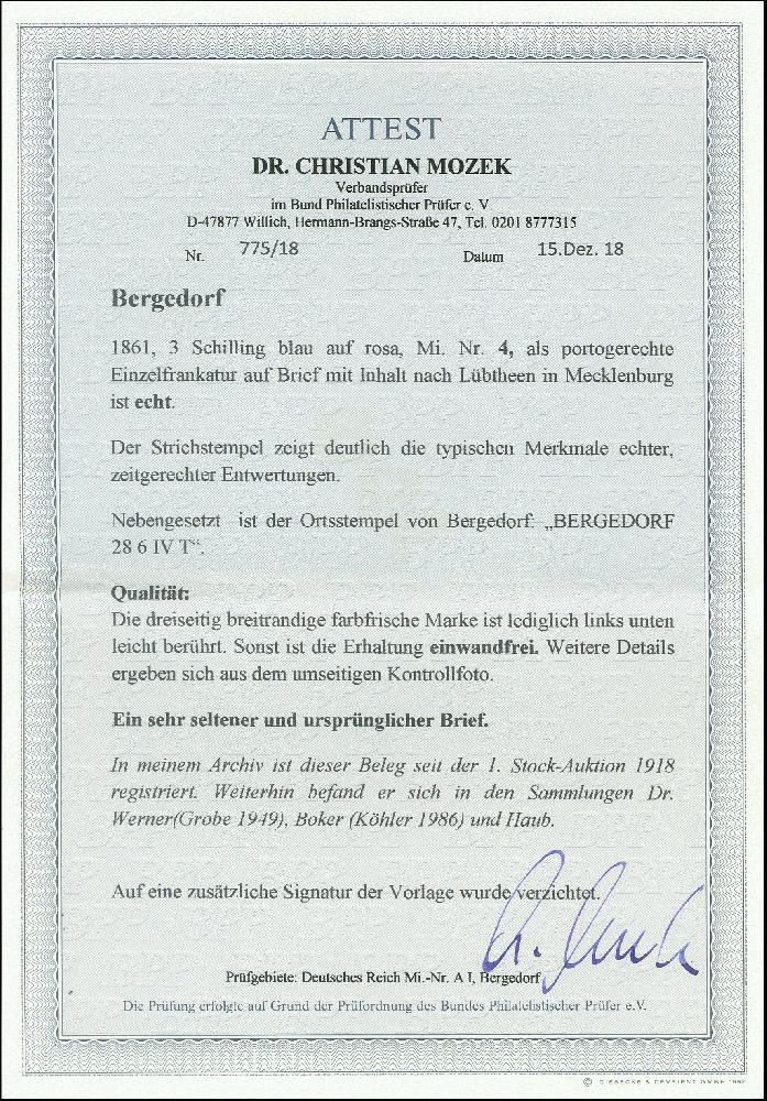 | Zusatzinformationen und Suchstichworte: | 370. Auktion Heinrich Köhler 8. Juni 2019 Los 49 1861, 3 Schilinge blau auf rosa, links unten ganz leicht berührt, sonst allseits voll- bis meist sehr breitrandig und sehr schön farbfrisch, mit leicht und sauber übergehend aufgesetztem Strichstempel und nebengesetztem Aufgabestempel "BERGEDORF 28 6 /IV T" auf komplettem Faltbrief nach Lübthen in Mecklenburg mit vorderseitigem privaten Eingangsvermerk. Ein sehr seltener Brief in frischer, tadelloser und ursprünglicher Erhaltung. Signiert Friedl und Fotoattest Dr. Mozek BPP (2018) Ausruf 6.000,00 EUR Zuschlag 7.500,00 EUR (aus der Sammlung Erivan Haub) |
