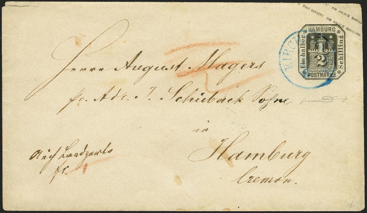 | Zusatzinformationen und Suchstichworte: | 370. Auktion Heinrich Köhler 8. Juni 2019 Los 50 1867, Hamburg Ganzsachenumschlag ½ Schilling schwarz mit sauber aufgesetztem blauem Kreisstempel "KIRCHWERDER 1../6", adressiert nach Hamburg mit Ankunftsstempel vom 14.6.; schöne und einwandfreie Erhaltung, lediglich rückseitig etwas rau geöffnet. Briefe der Post-Expedition Kirchwerder sind außerordentlich selten. Wir haben insgesamt keine 10 Belege registriert; auf Hamburg-Ganzsache ist der Stempel nur ein weiteres mal belegt. Fotoattest Dr. Mozek BPP (2012) Ausruf 5.000,00 EUR Zuschlag 5.000,00 EUR (aus der Sammlung Erivan Haub) |