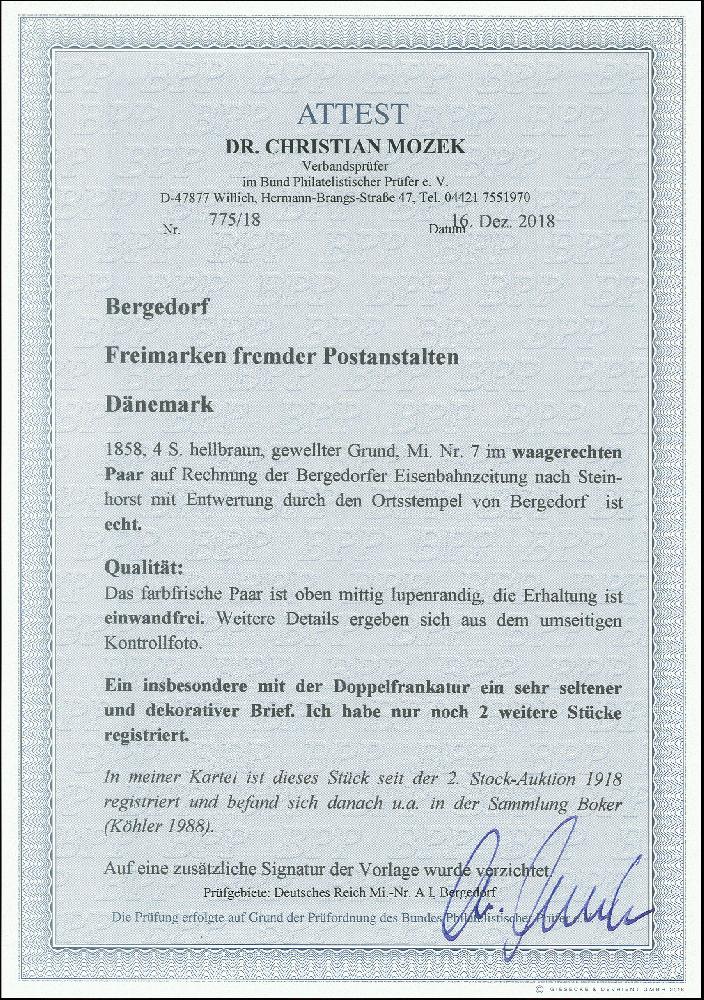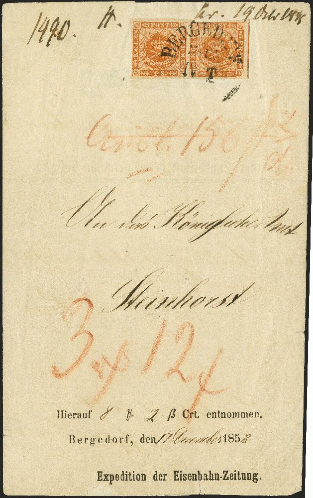 | Zusatzinformationen und Suchstichworte: | 370. Auktion Heinrich Köhler 8. Juni 2019 Los 51 1858, Dänemark 4 Schilling hellbraun im waagerechten Paar, oben mittig Lupen- sonst voll- bis überrandig, mit sauber übergehend aufgesetztem Ortsstempel "BERGEDORF 18 12/IV T" auf kompletter Rechnung der Bergedorfer Eisenbahnzeitung nach Steinhorst. Eine attraktive und aus Bergedorf sehr seltene Mehrfachfrankatur dieser Marke; die Köhler-Kartei nur drei weitere registriert. Fotoattest Dr. Mozek BPP (2018) Ausruf 4.000,00 EUR unverkauft (aus der Sammlung Erivan Haub) |