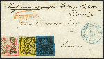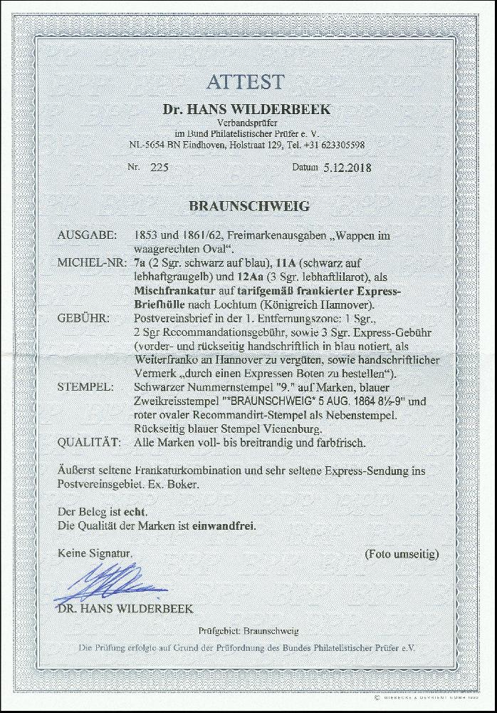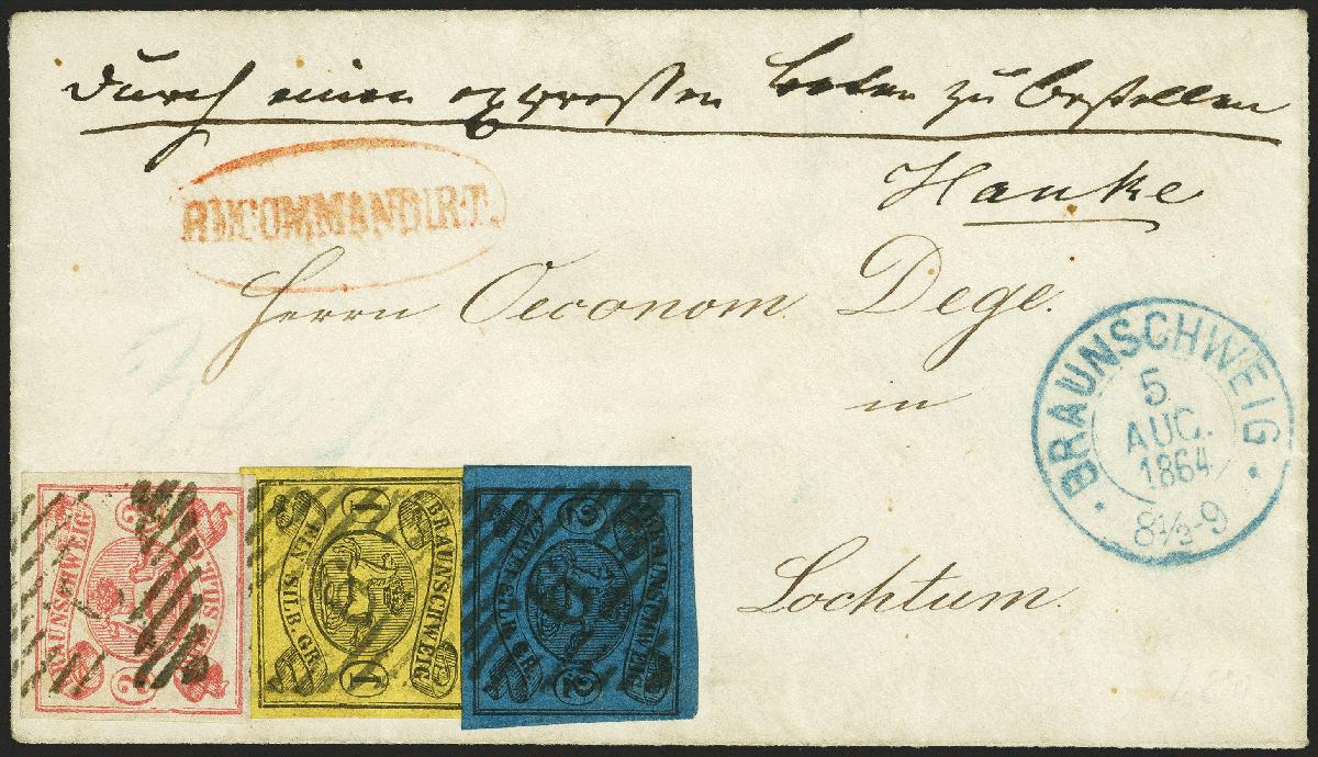 | Zusatzinformationen und Suchstichworte: | 370. Auktion Heinrich Köhler 8. Juni 2019 Los 62 1 Silbergroschen schwarz auf gelb und 3 Silbergroschen rosa in Mischfrankatur mit 1853, 2 Silbergroschen auf blau, alle farbfrisch und voll- bis meist breitrandig, mit jeweils sauber aufgesetztem Nummernstempel "9" und sauber nebengesetztem blauen Doppelkreisstempel "BRAUNSCHWEIG 5 AUG. 1864" auf kleinem rekommandierten Express-Kuvert nach Lochtum bei Vienenburg im Königreich Hannover mit handschriftlichem Vermerk "Durch einen expressen Boten zu bestellen". Das Porto setzt sich zusammen aus 1 Silbergroschen Vereinsporto für den 1. Rayon, 2 Silbergroschen Rekommandationsgebühr und 3 Silbergroschen Expressgebühr, welche vorder- und rückseitig als Weiterfranko notiert ist. Expressbriefe von Braunschweig sind sehr selten und 3-Farben-Frankaturen der geschnittenen Ausgaben ganz große Raritäten; in dieser Kombination haben wir kein weiteres Stück registriert. Ein phantastischer Brief. Fotoattest Dr. Wilderbeek BPP (2018) Ausruf 5.000,00 EUR Zuschlag 20.000,00 EUR (aus der Sammlung Erivan Haub) |