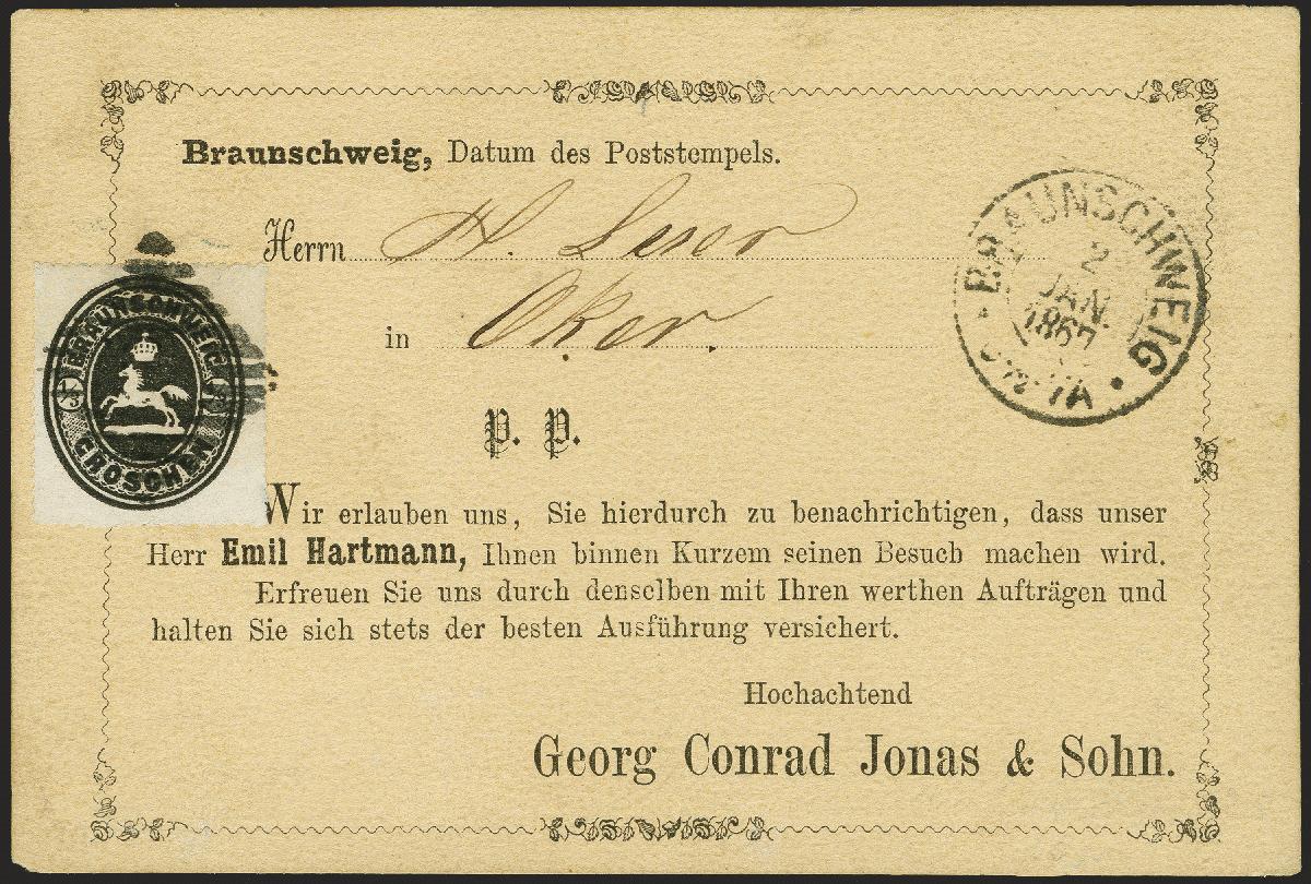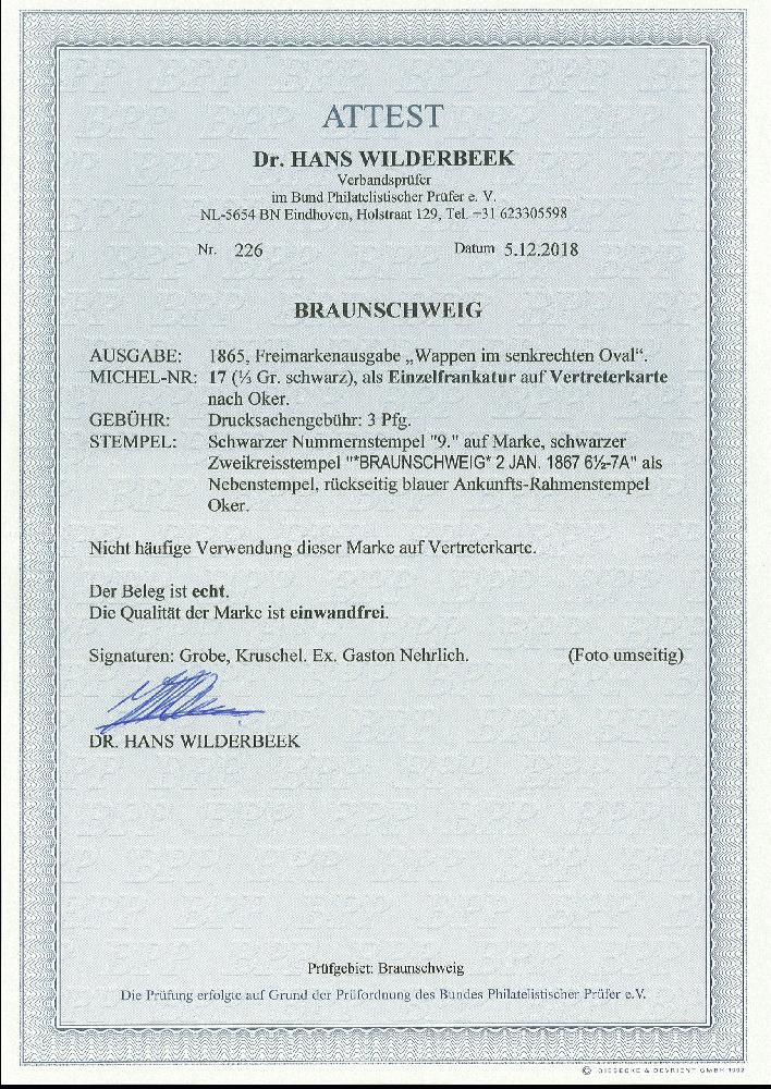 | Zusatzinformationen und Suchstichworte: | 370. Auktion Heinrich Köhler 8. Juni 2019 Los 63 1865, Ovalausgabe ½ Silbergroschen schwarz, farbfrisch und einwandfrei durchstochen mit sauber aufgesetztem Nummernstempel "9." und nebengesetztem schwarzen Doppelkreisstempel "BRAUNSCHWEIG 2 JAN. 1867" auf chamois farbener Vertreterkarte mit dekorativem Rankenmuster nach Oker mit rückseitigem Ankunftstempel. Eine sehr seltene Einzelfrankatur und zweifellos eines der schönsten Stücke der letzten Ausgabe. Signiert Grobe und Kruschel, Fotoattest Dr. Wilderbeek BPP (2018) Ausruf 2.000,00 EUR Zuschlag3,900,00 EUR (aus der Sammlung Erivan Haub) |