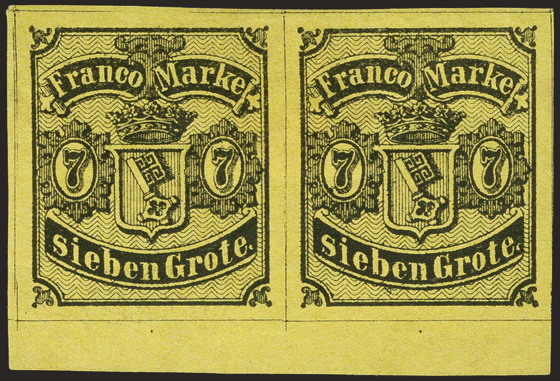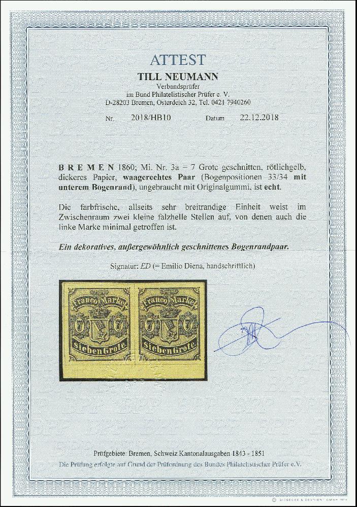 | Zusatzinformationen und Suchstichworte: | 370. Auktion Heinrich Köhler 8. Juni 2019 Los 70 1860, 7 Grote schwarz auf rötlichgelb im waagerechten Unterrandpaar, farbfrisch und allseits sehr breitrandig mit ca. 4 mm Bogenrand, ungebraucht mit Originalgummi. Zwischen den beiden Werten minimalst falzhell, davon das linke Markenbild gering getroffen. Schöne und frische Erhaltung. Signiert Emilio Diena und Fotoattest Neumann BPP (2018) Ausruf 200,00 EUR Zuschlag 360,00 EUR (aus der Sammlung Erivan Haub) |