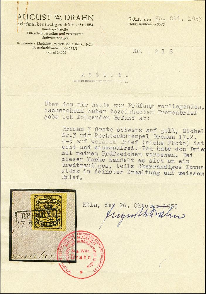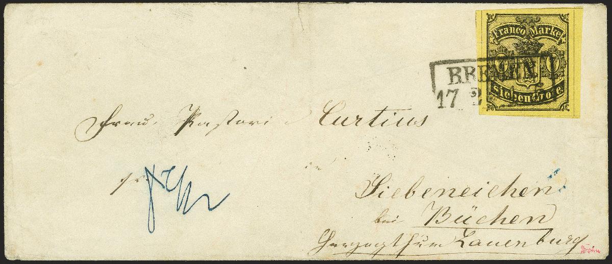 | Zusatzinformationen und Suchstichworte: | 370. Auktion Heinrich Köhler 8. Juni 2019 Los 71 7 Grote schwarz auf rötlichgelb, allseits sehr breit- bis überrandig, rechts mit Teil des Bogenrandes, mit sauber aufgesetztem Rahmenstempel "BREMEN 17 2" als Teilfrankatur auf Briefkuvert nach Siebeneichen bei Büchen im dänischen Herzogtum Lauenburg mit handschriftlichem Vermerk "fr. Hbg." (franko Hamburg). Die in Rötel notierte Taxe von "1 3/4" Schilling dänischem Anteil wurde weitgehend radiert. Die Marke war vom Brief gelöst und weist links oben leichte Auffaserungen auf, wo eine Tintenspur radiert wurde, sonst einwandfrei. Ein attraktiver und seltener Brief. Signiert Drahn mit Fotoattest (1953) sowie Fotoattest Neumann BPP (2018) Ausruf 2.000,00 EUR Zuschlag 6.500,00 EUR (aus der Sammlung Erivan Haub) |