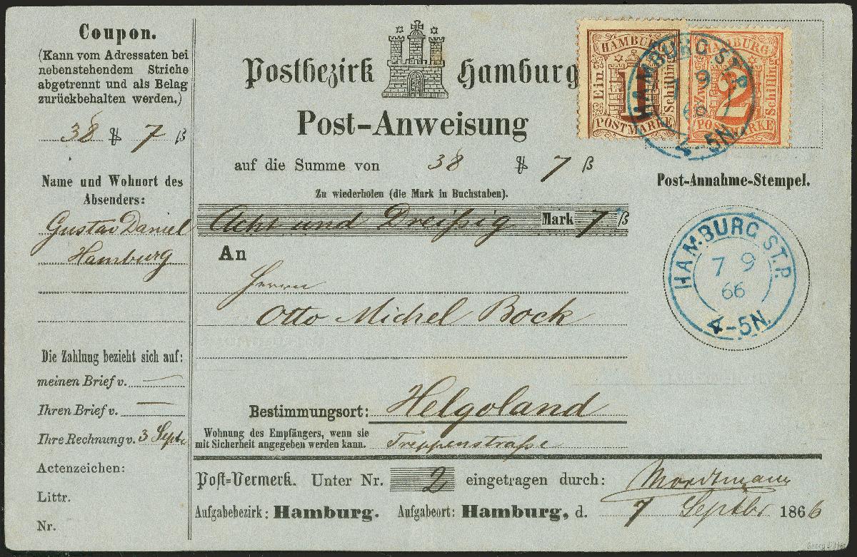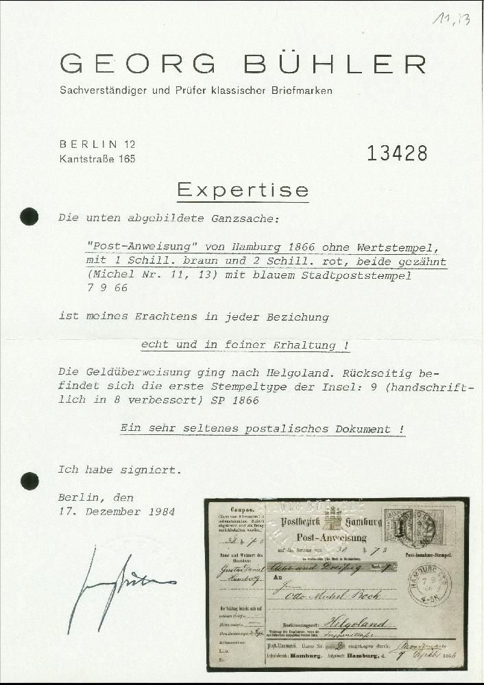| Zusatzinformationen und Suchstichworte: | 370. Auktion Heinrich Köhler 8. Juni 2019 Los 82 1864/67, Gezähnte Ausgabe 1 Schilling braun und 2 Schilling orangerot, beide farbfrisch und gut gezähnt mit blauem Doppelkreisstempel "HAMBURG ST.P. 7 9 66", zusätzlich nebengesetzt, auf vollständiger Postanweisung nach Helgoland mit rückseitigem Ankunftsstempel. Übliche leichte senkrechte Faltung im Formular, sonst einwandfrei. Signiert Georg Bühler mit Fotoattest (1984), Fotoattest Lange BPP (2004) Ausruf 1.000,00 EUR Zuschlag 1.000,00 EUR (aus der Sammlung Erivan Haub) |