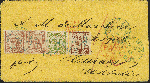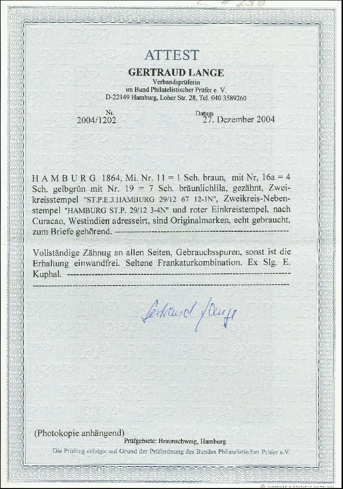 | Zusatzinformationen und Suchstichworte: | 370. Auktion Heinrich Köhler 8. Juni 2019 Los 84 1864/67, Gezähnte Ausgabe 1 Schilling braun, 4 Schilling grün und 2 Einzelwerte 7 Schilling bräunlichlila, als Streifen geklebt mit sauber auf- und zusätzlich nebengesetztem blauen Doppelkreisstempel "HAMBURG ST.P. E.3 29/12 67" auf gelbem Briefkuvert über London nach Curacao mit auf der Frankatur abgeschlagenem roten Ankunftsstempel vom 21.1.1868 sowie etwas übergehendem Verrechnungsstempel "12½ CENTS". Die Frankatur ganz leicht gereinigt, sonst in einwandfreier und frischer Erhaltung. Ein sehr attraktiver und seltener Brief, gelaufen während der Übergangszeit der altdeutschen Staaten in den NDP Ausruf 1.000,00 EUR Zuschlag 6.500,00 EUR (aus der Sammlung Erivan Haub) |