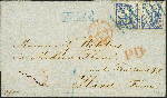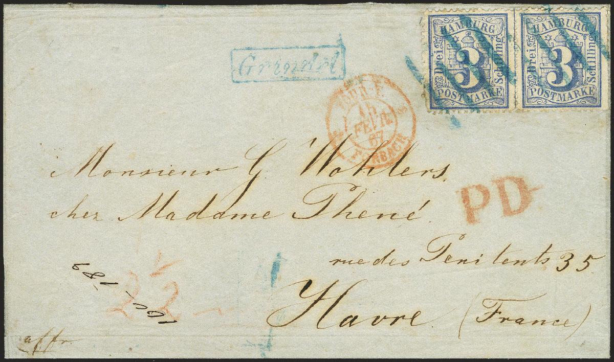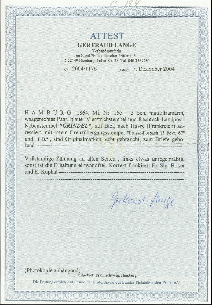 | Zusatzinformationen und Suchstichworte: | 370. Auktion Heinrich Köhler 8. Juni 2019 Los 85 1864/67, 3 Schilling ultramarinblau im waagerechtem Paar mit blauem Balkenstempel und nebengesetztem blauen Rahmenstempel der Landpoststelle "Grindel" auf Briefhülle mit Teil des Inhaltes nach Le Havre mit vorderseitigem Durchgangsstempel "TOUR-T. / FORBACH 15 FEVR. 67". Das Paar einige kurze Zähne rechts und links unten, sonst gute Erhaltung, insbesondere bei dem hier vorliegenden sehr dünnem Briefpapier. Ein attraktiver und seltener Brief; von allen Landpostorten sind insgesamt nur sind nur ein halbes Dutzend Auslandsbriefe bekannt. Fotoattest Lange BPP (2004) Ausruf 1.000,00 EUR Zuschlag 1.400,00 EUR (aus der Sammlung Erivan Haub) |