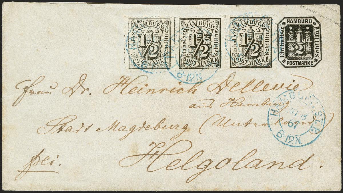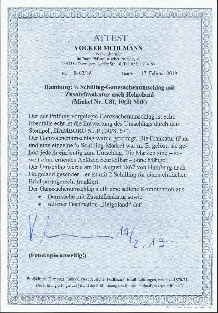 | Zusatzinformationen und Suchstichworte: | 370. Auktion Heinrich Köhler 8. Juni 2019 Los 87 1867, Umschlag ½ Schilling schwarz mit Wasserzeichen, mit wertstufengleicher Mischfrankatur ½ Schilling schwarz im waagerechten Paar und Einzelstück, mit blauem Doppelkreisstempel "HAMBURG ST. P. 30/8 67" nach Helgoland. Der Umschlag ist etwas gereinigt (die Frankatur war gelöst), sonst einwandfrei. Ein attraktives Stück. Fotoattest Mehlmann BPP (2019) Ausruf 500,00 EUR Zuschlag 1.700,00 EUR (aus der Sammlung Erivan Haub) |