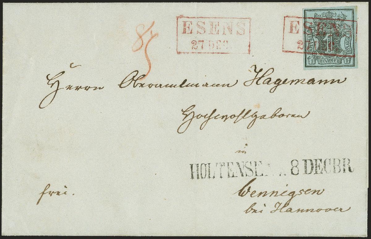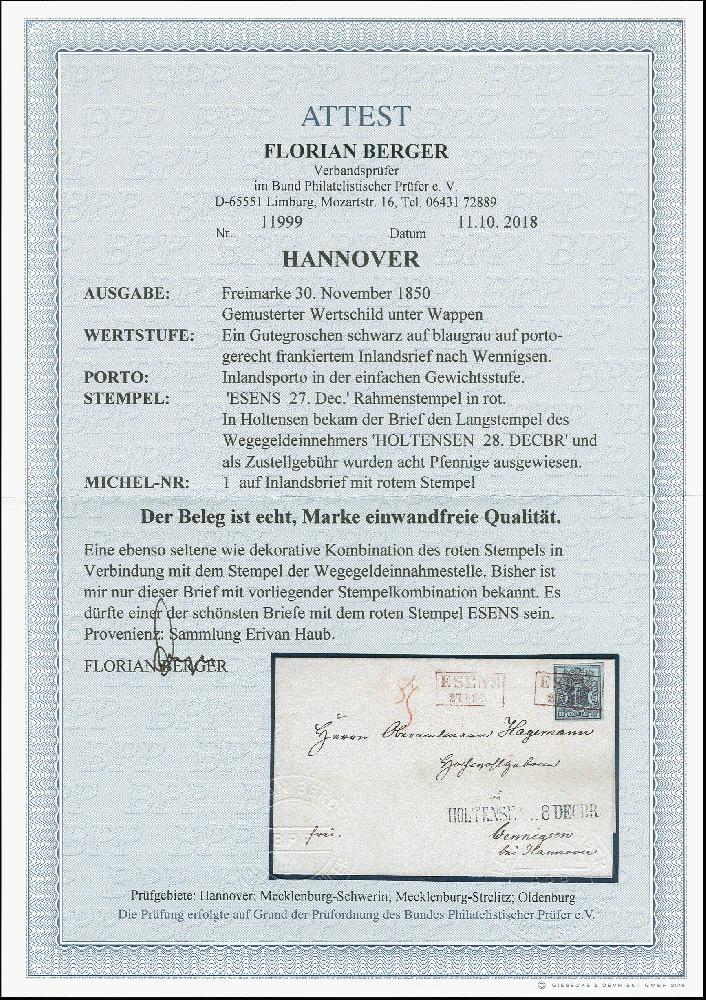 | Zusatzinformationen und Suchstichworte: | 370. Auktion Heinrich Köhler 8. Juni 2019 Los 94 1850, 1 Gutegroschen auf blaugrau, voll- bis breitrandig mit glasklar auf- und zusätzlich nebengesetztem roten Rahmenstempel "ESENS 27 DEC." auf Briefhülle nach Wennigsen mit vorderseitigem Langstempel "HOLTENSEN 8 DECBR" des Wegegeldeinnehmers; 8 Pfennige Zustellgebühr in Rötel ausgewiesen. Briefe der Nr. 1 mit dem roten Stempel von Esens sind selten, in der Kombination mit dem Ankunftsstempel der Briefsammlung von ganz besonderem Reiz. Ein sehr attraktiver Brief in tadelloser Erhaltung. Ausruf 1.000,00 EUR Zuschlag 6.500,00 EUR (aus der Sammlung Erivan Haub) |