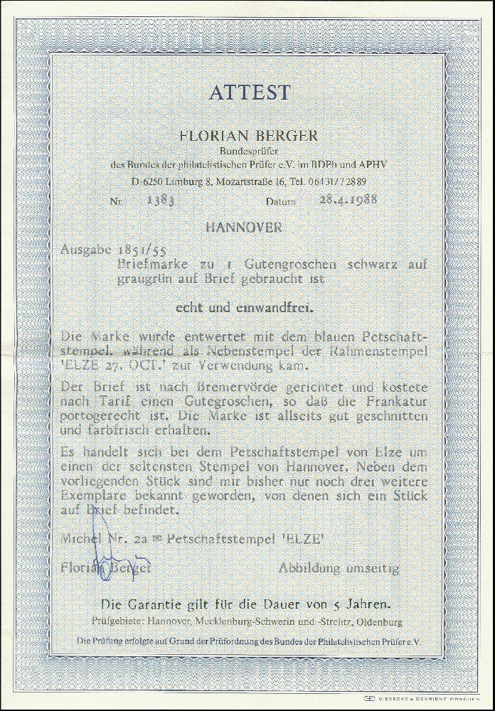 | Zusatzinformationen und Suchstichworte: | 370. Auktion Heinrich Köhler 8. Juni 2019 Los 97 1851, 1 Gutegroschen auf graugrün, voll- bis breitrandig mit sauber übergehend aufgesetztem blauem Petschaftstempel auf Briefhülle mit nebengesetztem Rahmenstempel "ELZE 27 OCT." nach Bremervörde mit Ankunftsstempel vom nächsten Tag. Der Petschaftstempel von Elze gehört zu den großen Stempel-Seltenheiten Hannovers von der nur ein weiterer Brief, ein Briefstück mit 4 Einzelmarken (ex. Boker) und ein 3er-Streifen der Nr. 2 registriert sind. Ein phantastisches Stück. Fotoattest Berger BPP (1988) Ausruf 8.000,00 EUR Zuschlag 13.000,00 EUR (aus der Sammlung Erivan Haub) |