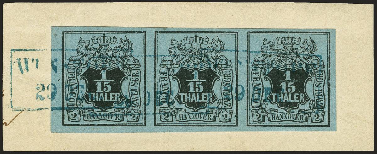| Zusatzinformationen und Suchstichworte: | 370. Auktion Heinrich Köhler 8. Juni 2019 Los 100 1851/55, Postvereinsausgabe 1/15 Thaler schwarz auf graublau im waagerechten 3er-Streifen, voll- bis meist breitrandig und sehr schön farbfrisch, mit leicht aufgesetztem Rahmenstempel "WUNSTORF 29 DEC." auf Briefstück. Die größte bekannte Einheit dieser Marke in besonders schöner Erhaltung. Fotoattest Berger BPP (2018) Ausruf 1000,00 EUR Zuschlag 2.200,00 EUR (aus der Sammlung Erivan Haub) |