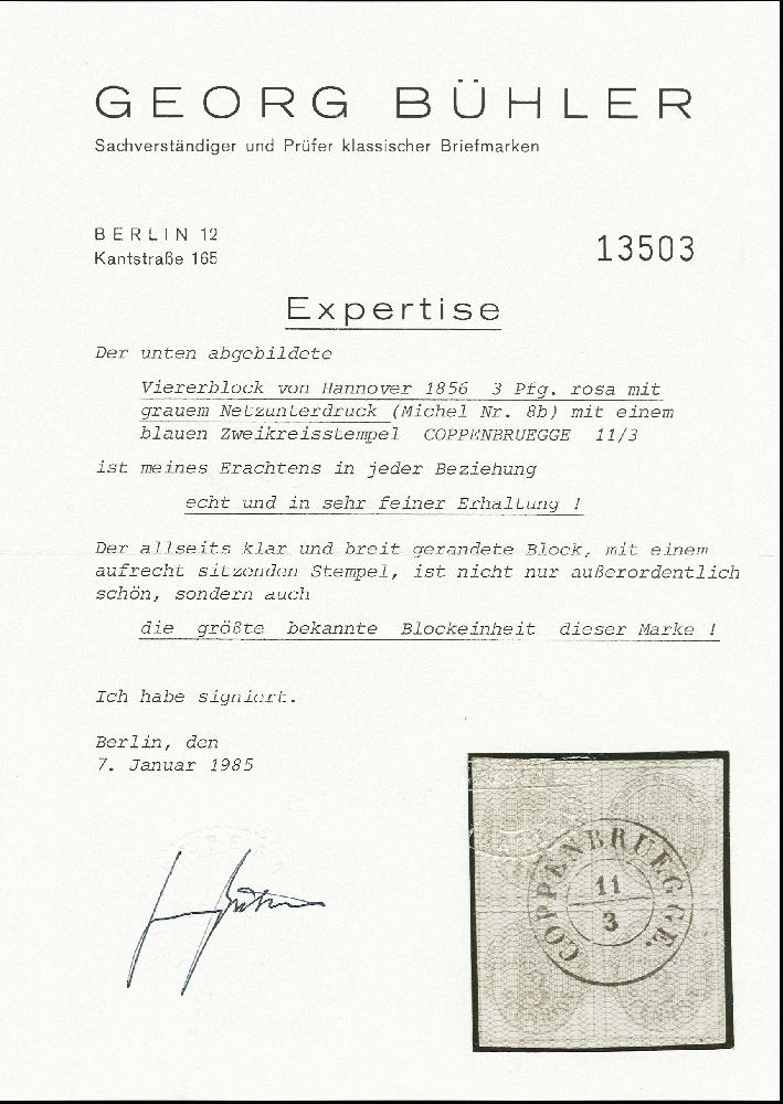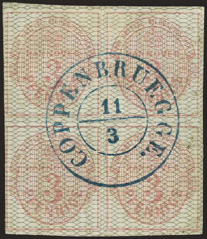 | Zusatzinformationen und Suchstichworte: | 370. Auktion Heinrich Köhler 8. Juni 2019 Los 102 1856/57, Wappenausgabe 3 Pfennig helllilakarmin, grau genetzt, im 4er-Block, voll- bis breitrandig und farbfrisch mit zentrisch und gerade aufgesetztem Doppelkreisstempel "COPPENBRUEGGE 11/3". Zwischen den Marken leichte waagerechte Bugspur, sonst einwandfrei. Größte bekannte Einheit dieser Marke in besonders schöner Erhaltung. Fotoattest Berger BPP (2018) Ausruf 800,00 EUR Zuschlag 1.700,00 EUR (aus der Sammlung Erivan Haub) |