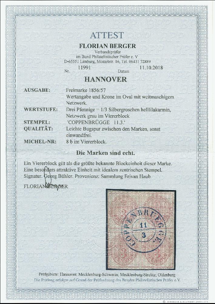| Zusatzinformationen und Suchstichworte: | 370. Auktion Heinrich Köhler 8. Juni 2019 Los 102 1856/57, Wappenausgabe 3 Pfennig helllilakarmin, grau genetzt, im 4er-Block, voll- bis breitrandig und farbfrisch mit zentrisch und gerade aufgesetztem Doppelkreisstempel "COPPENBRUEGGE 11/3". Zwischen den Marken leichte waagerechte Bugspur, sonst einwandfrei. Größte bekannte Einheit dieser Marke in besonders schöner Erhaltung. Fotoattest Berger BPP (2018) Ausruf 800,00 EUR Zuschlag 1.700,00 EUR (aus der Sammlung Erivan Haub) |