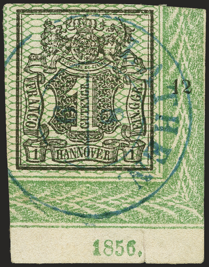 | Zusatzinformationen und Suchstichworte: | 370. Auktion Heinrich Köhler 8. Juni 2019 Los 108 1 Gutegroschen schwarz, grün genetzt, rechte untere Bogenecke, breitrandig mit Bordürenrändern, Reihenzähler "12" und Jahreszahl "1856", leicht entwertet Doppelkreisstempel "LATHEN 8/9". Neben der Jahreszahl kleiner Randspalt und diagonale Bugspur im Unterrand. Ein sehr schönes Stück. Fotobefund Berger BPP (2018) Ausruf 200,00 EUR Zuschlag 340,00 EUR (aus der Sammlung Erivan Haub) |
