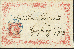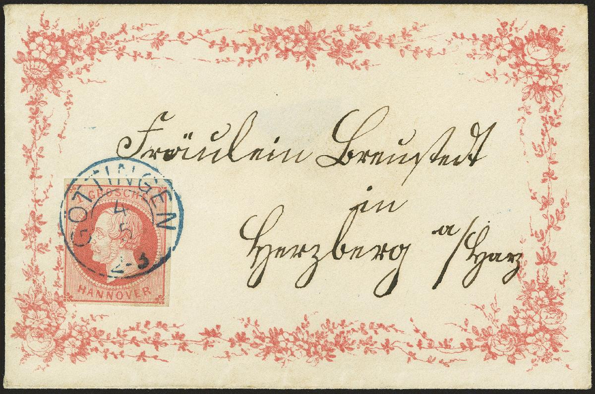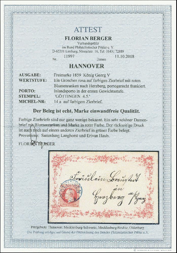 | Zusatzinformationen und Suchstichworte: | 370. Auktion Heinrich Köhler 8. Juni 2019 Los 111 1 Groschen rosa, voll- bis breitrandig mit klar aufgesetztem kleinen blauen Doppelkreisstempel "GÖTTINGEN 4/5" auf kleinem Damenkuvert mit aufwendigem Zierdruck aus rosafarbenen Blumenranken vorder- und rückseitig, adressiert nach Herzberg mit rückseitigem Ankunftstempel. Rückseitig kleines Siegel ausgeschnitten, sonst tadellos. Ein besonders attraktiver und seltener Zierbrief. Fotoattest Berger BPP (2018) Ausruf 500,00 EUR Zuschlag 4.400,00 EUR (aus der Sammlung Erivan Haub) |