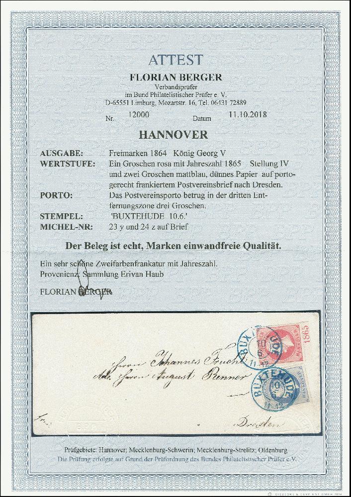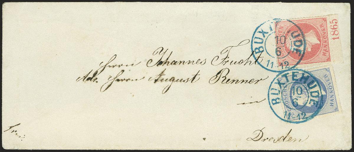 | Zusatzinformationen und Suchstichworte: | 370. Auktion Heinrich Köhler 8. Juni 2019 Los 113 1864, durchstochene Ausgabe 1 Groschen rosa, Unterrandstück mit Jahreszahl "1865" in Stellung IV, zusammen mit 2 Groschen mattblau auf dünnem Papier, mit jeweils sauber aufgesetztem Doppelkreisstempel "BUXTEHUDE 10/6" auf kleinem Briefkuvert nach Dresden mit rückseitigem Ausgabestempel mit Uhrzeit; eine schöne und ungewöhnliche Farbfrankatur, Fotoattest Berger BPP (2018) Ausruf 200,00 EUR Zuschlag 1.300,00 EUR (aus der Sammlung Erivan Haub) |