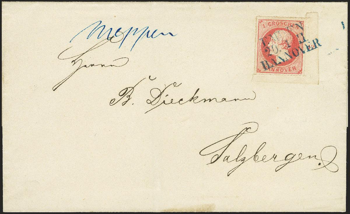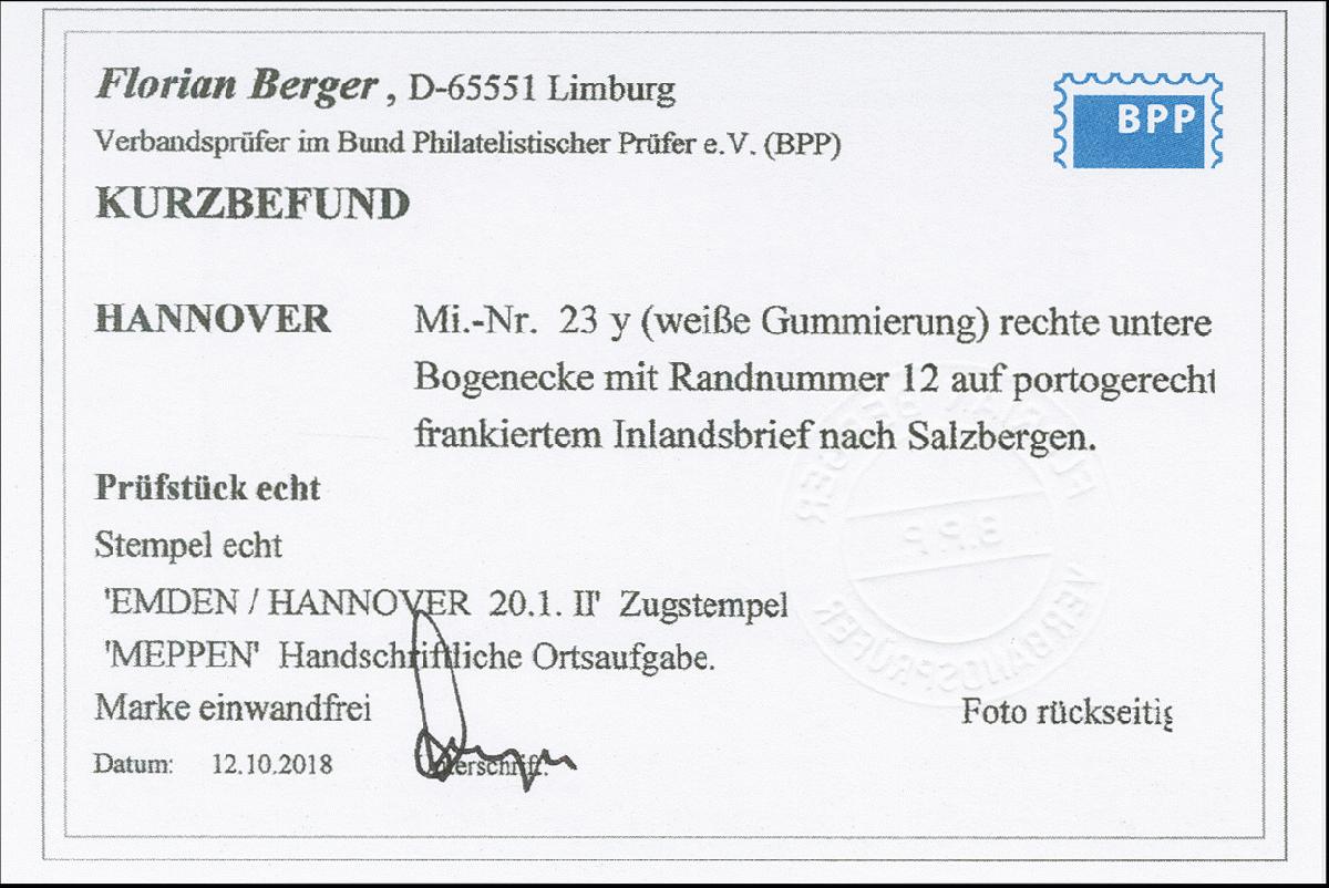 | Zusatzinformationen und Suchstichworte: | 370. Auktion Heinrich Köhler 8. Juni 2019 Los 114 1 Groschen rosa, rechte untere Bogenecke mit Randnummer "12" mit sauber aufgesetztem Bahnpost-Dreizeiler "EMDEN/20.1 II/HANNOVER" auf Briefhülle mit handschriftlichem Aufgabevermerk "Meppen" nach Salzbergen. Kurzbefund Berger BPP (2018) Ausruf 100,00 EUR Zuschlag 280,00 EUR (aus der Sammlung Erivan Haub) |