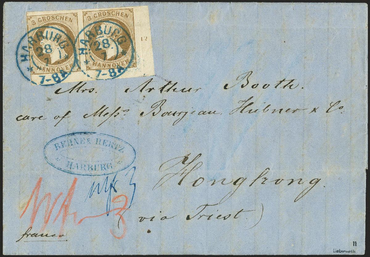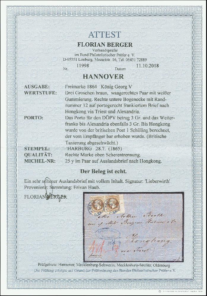 | Zusatzinformationen und Suchstichworte: | 370. Auktion Heinrich Köhler 8. Juni 2019 Los 115 1864, durchstochene Ausgabe 3 Groschen braun in waagerechtem Paar aus der rechten unteren Bogenecke mit vollen Bogenrändern und Reihenzähler "12", mit sauber aufgesetztem Doppelkreisstempel "HARBURG 28/7" (1856) auf vollständigem Faltbrief über Triest und Alexandria nach Hong Kong. Der Brief ist frankiert und bezahlt bis Alexandria mit 3 Groschen Postvereinsporto sowie 3 Groschen österreichischem Seeporto von Triest nach Alexandria. Das Porto jenseits von Alexandria in Höhe von 1 Schilling wurde von der britischen Post vorderseitig notiert (abgeschwächt) und vom Empfänger eingezogen. Die Frankatur teils Scherentrennung und leichter Briefknitter, sonst einwandfrei. Ein in dieser Form seltener und attraktiver Brief nach China; eine derartige Teilfrankatur nach Übersee haben wir von Hannover nur noch auf einem Brief nach Indien registriert. Signiert Lieberwirth und Fotoattest Berger BPP (2018) Ausruf 4.000,00 EUR Zuschlag 19.000,00 EUR (aus der Sammlung Erivan Haub) |