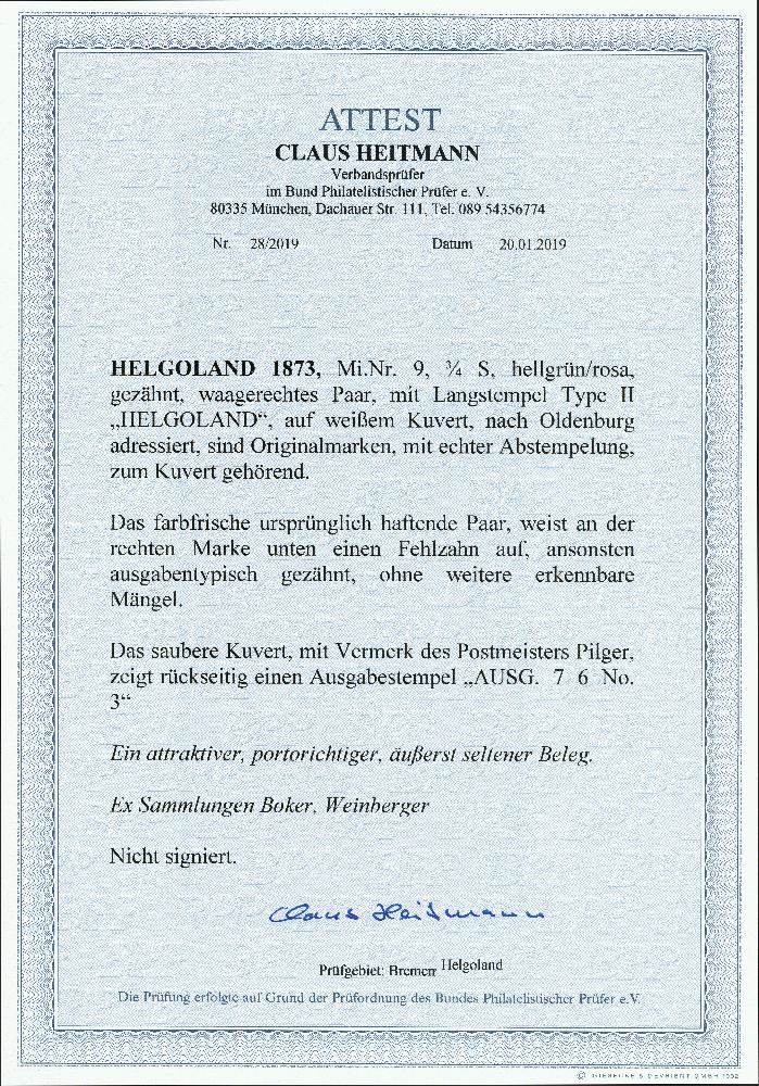| Zusatzinformationen und Suchstichworte: | 370. Auktion Heinrich Köhler 8. Juni 2019 Los 119 1873, 3/4 Schilling hellgrün/rosa im waagerechten Paar, sehr schön farbfrisch und bis auf einen Fehlzahn unten rechts gut gezähnt, mit zweimal sauber übergehend abgeschlagenem Langstempel "HELGOLAND" auf kleinem Briefkuvert mit vorderseitigem Absendervermerk des Postmeisters Pilger nach Oldenburg mit rückseitigem Ausgabestempel vom 7. Juni. Eine äußerst attraktive portogerechte Frankatur. Mehrfachfrankaturen dieser Marke gehören zu den großen Briefseltenheiten Altdeutschlands; die Köhler-Kartei hat nur zwei weitere Briefe registriert (beide mit Rundstempel und einer mit fehlerhafter Frankatur). Ein unübertreffliches Stück. Fotoattest Heitmann BPP (2019) Ausruf 5.000,00 EUR Zuschlag 7.000,00 EUR (aus der Sammlung Erivan Haub) |