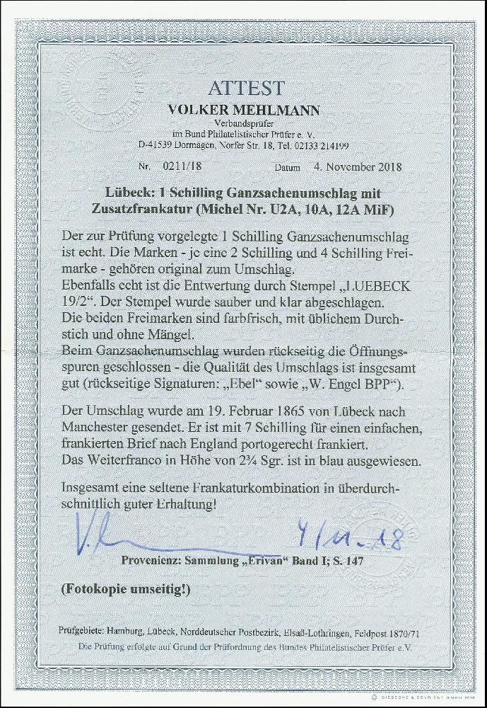| Zusatzinformationen und Suchstichworte: | 370. Auktion Heinrich Köhler 8. Juni 2019 Los 128 1863, Wertstempel links, Umschlag 1 Schilling rötlichorange mit Zufrankatur 2 Schilling karmin und 4 Schilling olivbraun, als Streifen geklebt mit Ortsstempel "LUEBECK 19/2" (1865) nach Manchester mit rückseitigem Ankunftsstempel. Der Umschlag rückseitig etwas rauh geöffnet und Einrisse in der Rückklappe mit Falzen geklebt, sonst einwandfrei. Ein schöner und seltener Auslandsbrief. Fotoattest Mehlmann BPP (2018) Ausruf 1.000,00 EUR Zuschlag 1.500,00 EUR (aus der Sammlung Erivan Haub) |