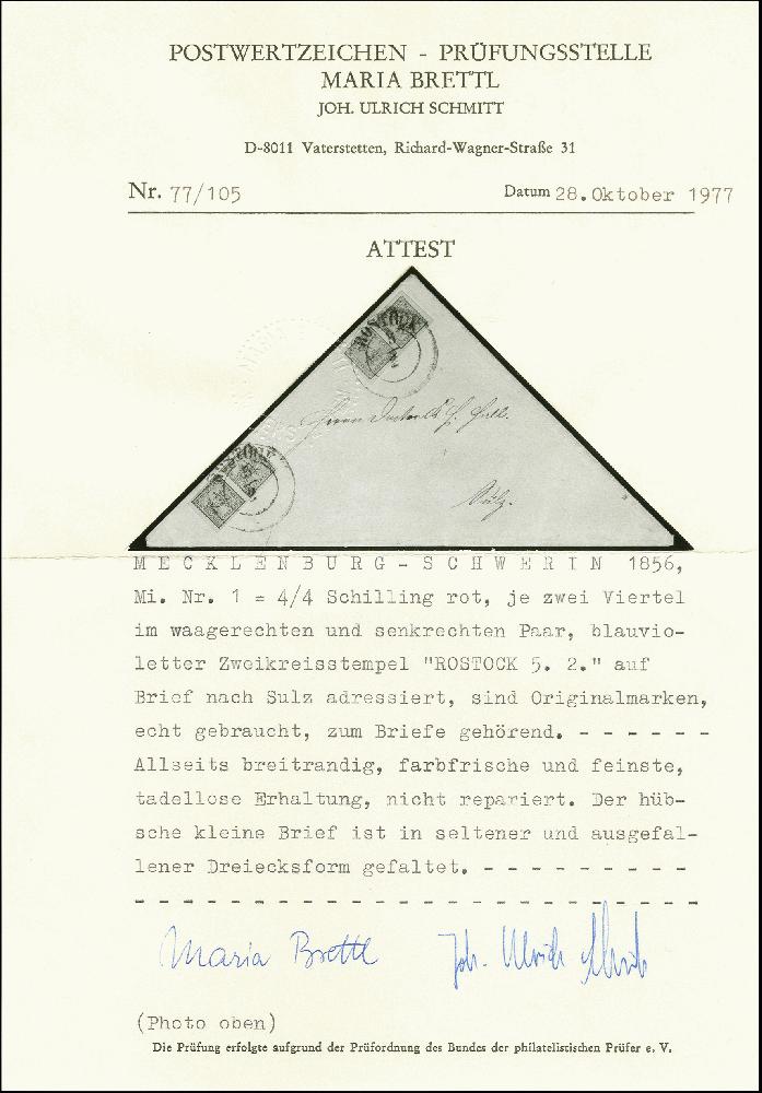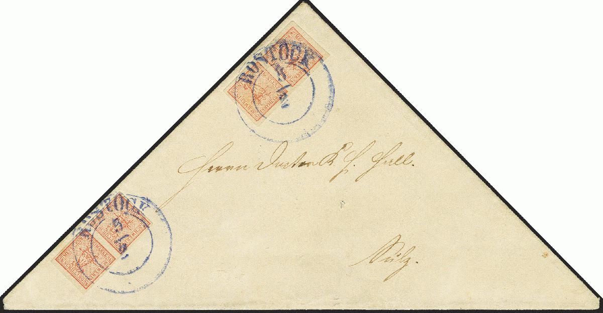 | Zusatzinformationen und Suchstichworte: | 370. Auktion Heinrich Köhler 8. Juni 2019 Los 132 2/4 Schilling graurot, waagerechte und senkrechte Kombination, beide allseits breitrandig und farbfrisch mit jeweils sauber aufgesetztem violettblauem Doppelkreisstempel "ROSTOCK 5/2" auf dreieckig gefalteter Briefhülle nach Sulz. Im Kuvert außerhalb der Frankatur kleines Aufnadelungsloch, sonst tadellose und sehr frische Erhaltung. Ein ganz ungewöhnliches und dekoratives Stück. Fotoattest Brettl/Schmitt (1977) Ausruf 200,00 EUR Zuschlag 3.900,00 EUR (aus der Sammlung Erivan Haub) |