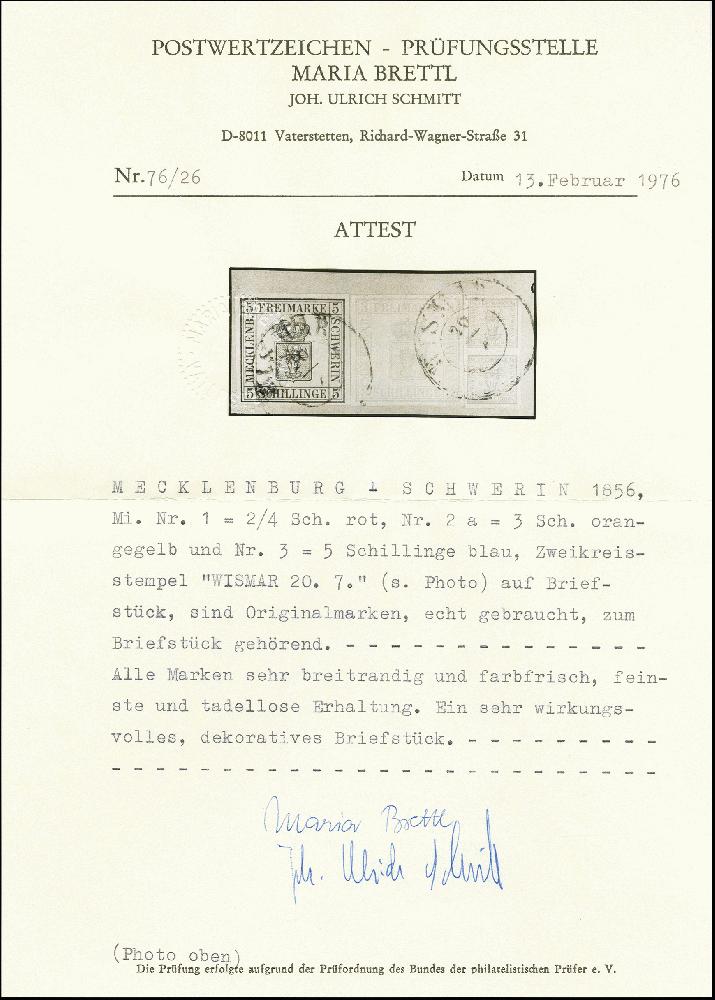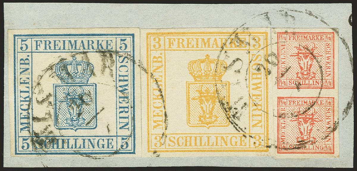 | Zusatzinformationen und Suchstichworte: | 370. Auktion Heinrich Köhler 8. Juni 2019 Los 137 1856, 5 Schilling blau, 3 Schilling dunkelchromgelb und 2/4 Schilling graurot, alle farbfrisch und breitrandig, als Streifen geklebt mit Doppelkreisstempel " WISMAR 20/.." auf kleinem Briefstück, Kabinett, eine attraktive und seltene Farbfrankatur. Fotoattest Brettl/Schmitt (1976) Ausruf 500,00 EUR Zuschlag 1.500,00 EUR (aus der Sammlung Erivan Haub) |