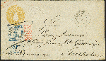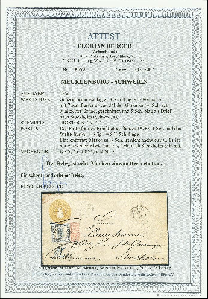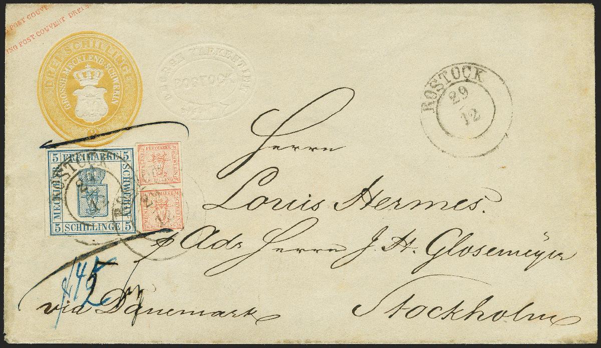| Zusatzinformationen und Suchstichworte: | 370. Auktion Heinrich Köhler 8. Juni 2019 Los 138 5 Schilling blau und 2/4 Schilling graurot, beide farbfrisch und voll- bis breitrandig, als Zufrankatur auf Ganzsachenumschlag 3 Schilling gelb mit Doppelkreisstempel "ROSTOCK 29/12" nach Stockholm mit Leitvermerk "Via Dänemark". Rückseitig Bahnpoststempel "Hagenow-Rostock" und Durchgangsstempel des dänischen Oberpostamtes von Hamburg. Nach dem ab 1. Februar 1854 gültigen Postvertrag betrug das Porto für einen einfachen Brief über Dänemark nach Schweden 1 Silbergroschen Vereinsporto und 4 ½ Silbergroschen Weiterfranko entsprechend 8 3/4 Schillingen; der Brief war also um 1/4 Schilling unterfrankiert. Das Weiterfranko ist ursprünglich korrekt mit "fr 4 1/2" notiert, jedoch in "5 fr." abgeändert. Ein interessanter und sehr seltener Auslandsbrief; wir haben von Mecklenburg-Schwerin nur drei weitere nach Schweden registriert, davon einer über Lübeck und zwei über Stralsund. Fotoattest Berger BPP (2007) Ausruf 3.000,00 EUR Zuschlag 12.000,00 EUR (aus der Sammlung Erivan Haub) |