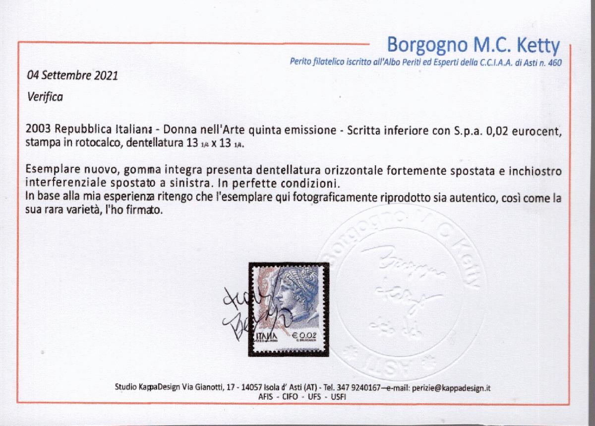 | Zusatzinformationen und Suchstichworte: | Übersetzung: 2003 Italienische Republik - "Frau in der Kunst", fünfte Ausgabe - untere Beschriftung mit s.p.a. 0,02 Eurocent Tiefdruck, Zähnung 13 x 13. Postfrisches Exemplar, Gummierung intakt, horizontale Zähnung stark verschoben und Druckfarbe nach links verschoben, in einwandfreier Erhaltung. Aufgrund meiner Erfahrungen glaube ich, dass das hier abgebildete Exemplar echt ist, ebenso wie die seltene Sorte. Ich habe signiert. |
