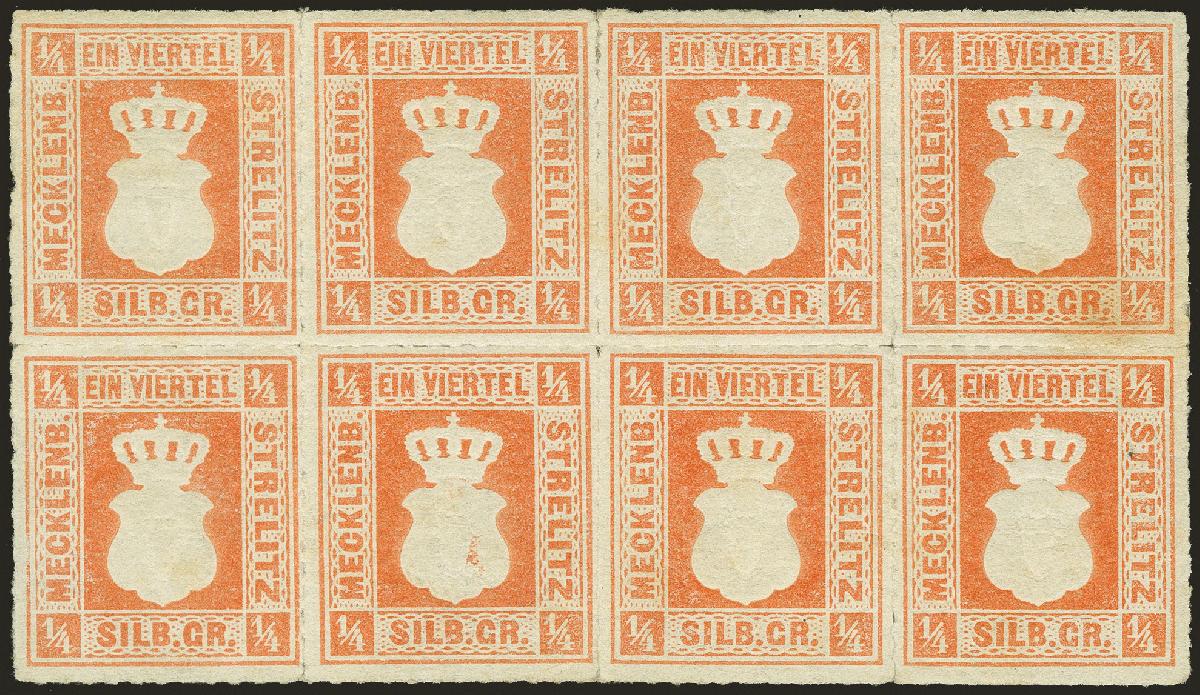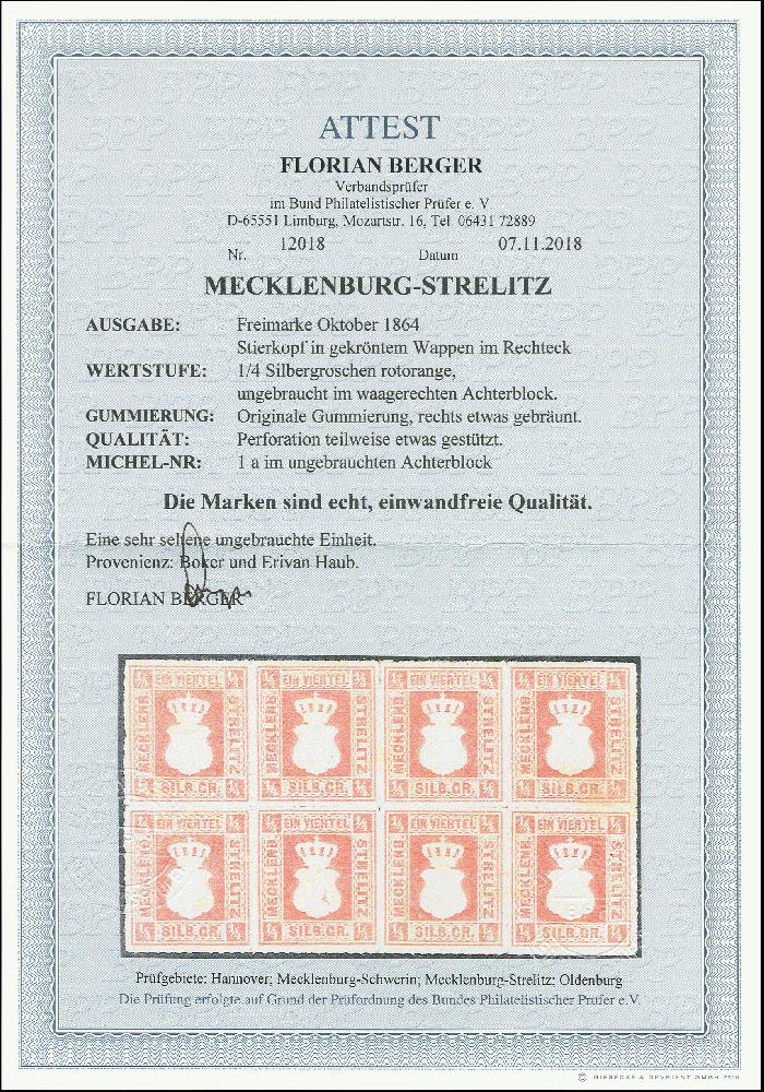 | Zusatzinformationen und Suchstichworte: | 370. Auktion Heinrich Köhler 8. Juni 2019 Los 143 1864 Wappenausgabe ¼ Silbergroschen rotorange im waagerechten 8er-Block, farbfrisch und gut durchstochen, ungebraucht mit Originalgummi ( dieser rechts etwas gebräunt). Durchstich teils durch Falze gestützt, insgesamt gute und frische Erhaltung. Eine sehr seltene Einheit. Fotoattest Berger BPP (2018) Ausruf 1.000,00 EUR Zuschlag 8.500,00 EUR (aus der Sammlung Erivan Haub) |