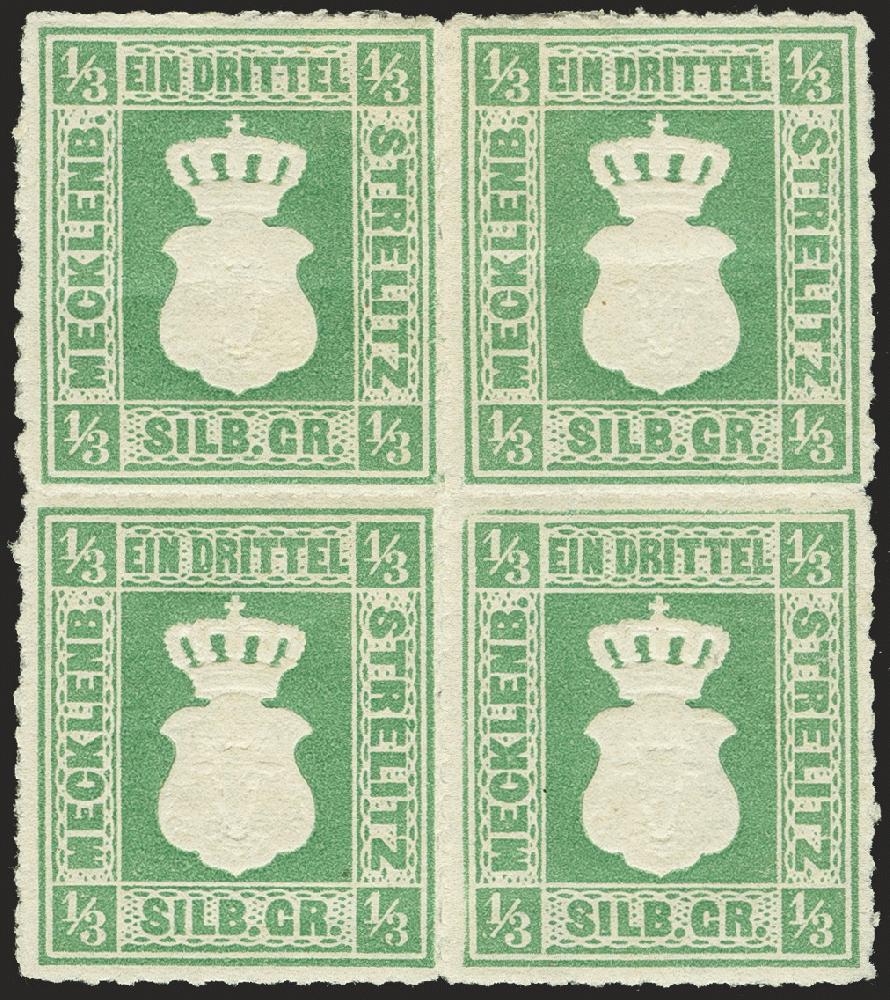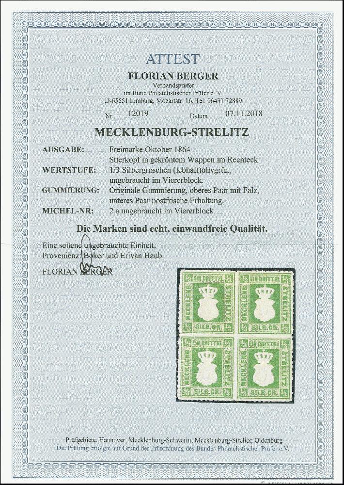 | Zusatzinformationen und Suchstichworte: | 370. Auktion Heinrich Köhler 8. Juni 2019 Los 144 1/3 Silbergroschen olivgrün im 4er-Block, farbfrisch und einwandfrei durchstochen, ungebraucht mit Originalgummi, das untere Paar postfrisch und unsigniert, Kabinett. Fotoattest Berger BPP (2018) Ausruf 200,00 EUR Zuschlag 2.200,00 EUR (aus der Sammlung Erivan Haub) |